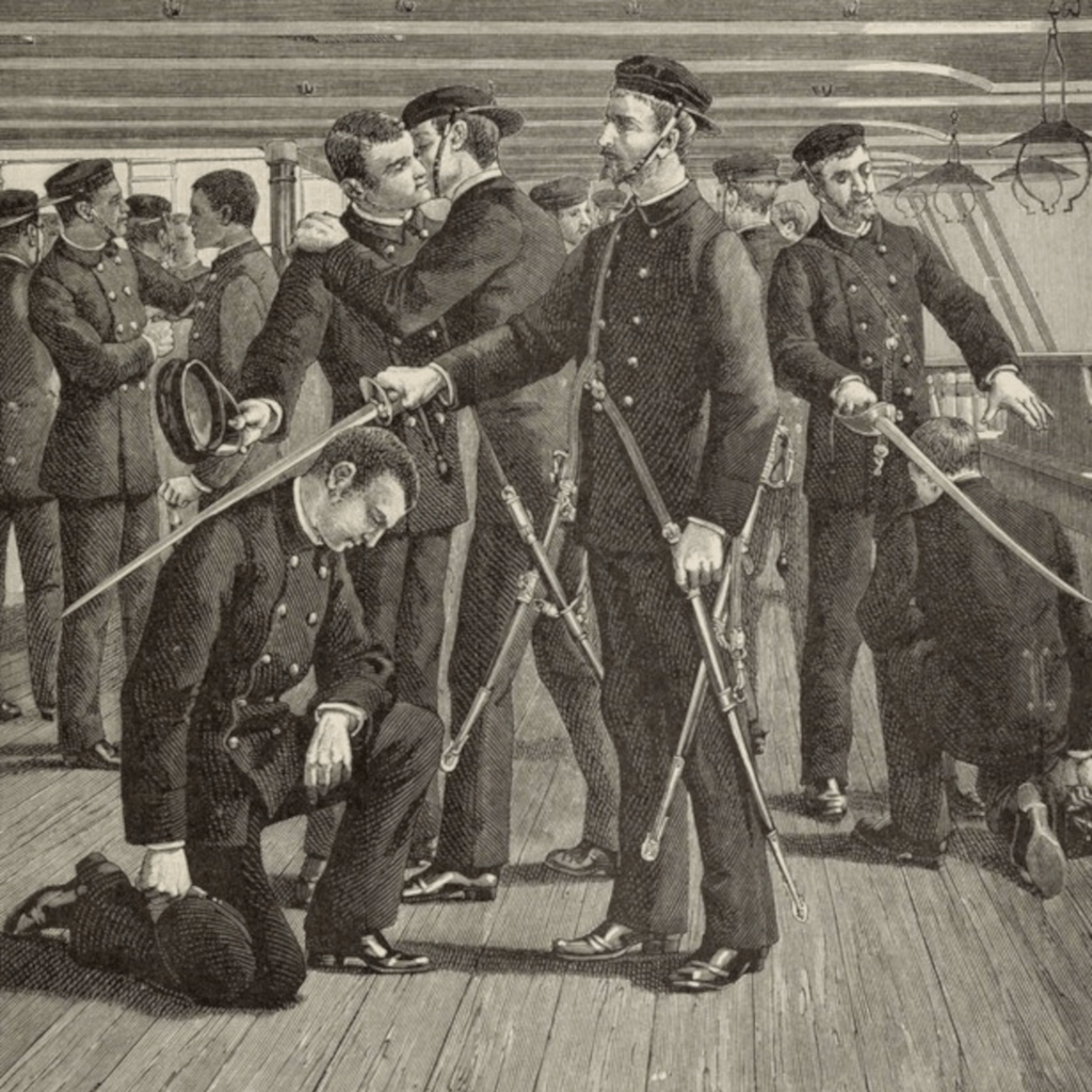 Ce jour-là, à huit heures et demie du matin, à peine le déjeuner terminé, un coup de sifflet retentit tout à coup sur le pont, d’où les fistots sont expulsés par leurs anciens qui le forcent à descendre dans leur batterie. Là, leur major, qui dès le matin a reçu des instructions de son collègue ancien, fait ranger ses camarades sur quatre rangs, dans l’ordre de leurs numéros matricules, et à bâbord.