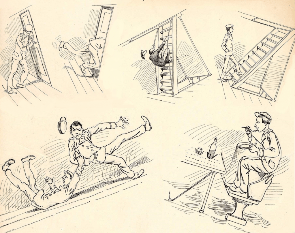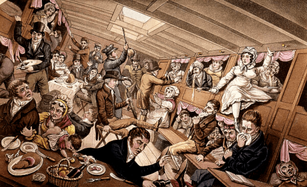 Il n’existe malheureusement pas de solutions miracles pour combattre le mal de mer dans de semblables conditions. On se contente de suggérer de prendre une légère collation avant d’embarquer, de prendre un grog et de se serrer la ceinture ou de se sangler l’abdomen ! Solutions bien rudimentaires qui, on le conçoit bien, ne sont d’aucune utilité pour une traversée de plus d’un ou deux jours. On suggèrera encore aux dames de rester allongées pendant le voyage, tandis que les hommes considérés plus résistants, ou voulant se montrer comme tels, restent sur le pont, tentant de suivre les mouvements du navire en gardant le regard porté sur l’horizon.