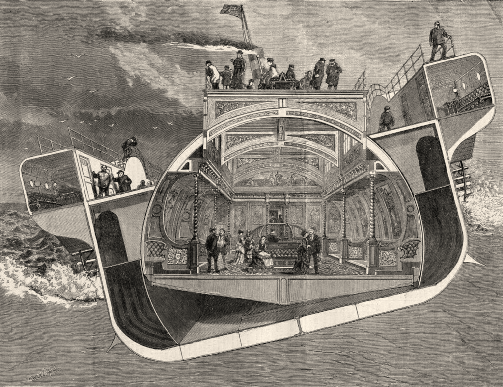 Un autre ingénieur britannique, Henry Bessemer (1813-1898), va proposer à la même période une autre solution qui semble particulièrement fantaisiste : un navire pourvu d’un compartiment central à même de pivoter latéralement, indépendamment du reste du bâtiment, de manière à compenser le roulis.