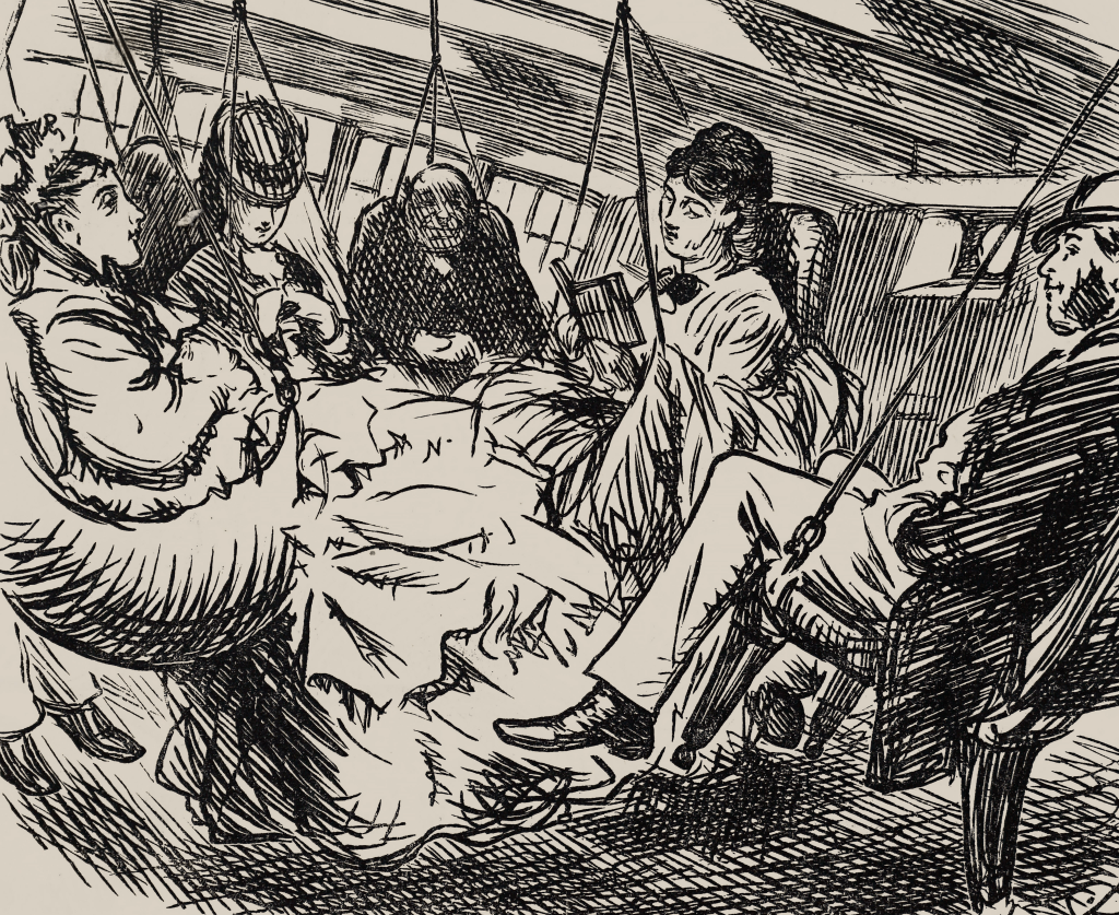 Notre bon navire roule d’une manière affreuse, à chaque repas nous devons nous accrocher aux tables et aux sièges et empêcher nos tasses d’errer partout dans la cabine. Pendant la nuit, nous avons été constamment en mouvement d’un côté puis de l’autre.