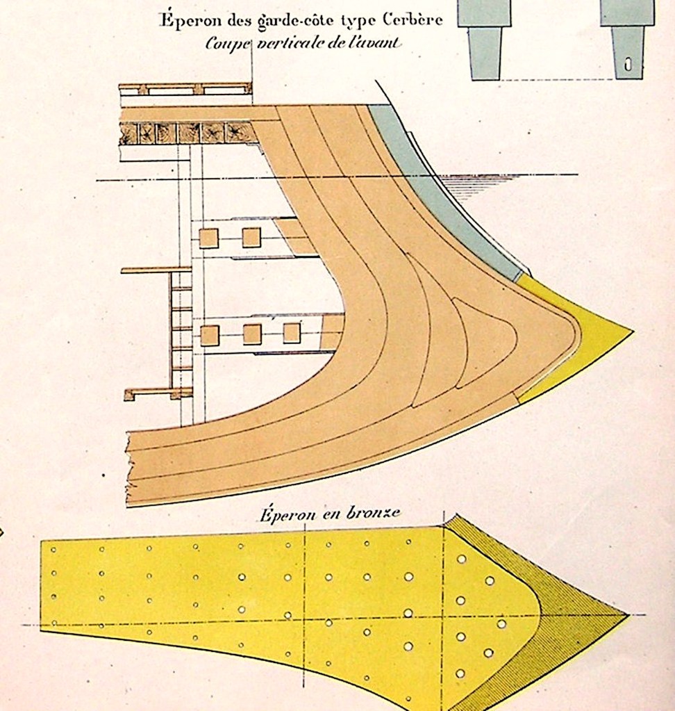 Toujours construit sur une charpente de bois, la forme générale du bâtiment était peu changée par rapport à celle du Taureau, mais la carapace « en dos de tortue » était légèrement blindée (1,50 centimètres), au-dessus d’un pont horizontal en bois qui ne l’était plus. La carapace, formant tunnel, était percée sur les côtés d’une vingtaine de petits hublots à volets métalliques, éclairant le pont principal. Ces hublots étaient certainement fermés à la mer. Le blindage latéral avait été porté à 22 centimètres à la flottaison et celui de la tourelle à 18 centimètres.