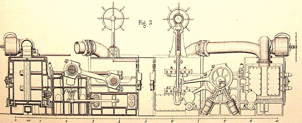 à gauche, et vue de la face avant de la machines de bâbord, à droite.