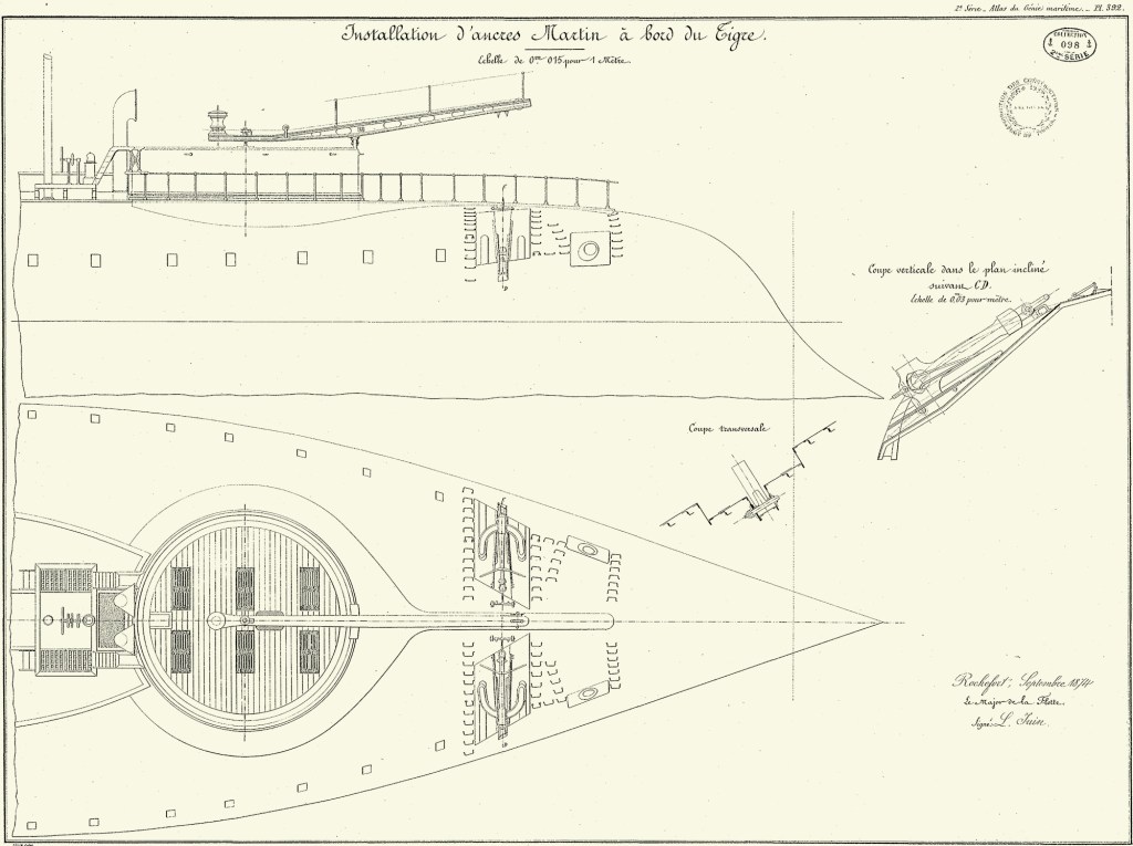 Cette disposition ne put être modifiée que par l’adoption des ancres Martin, qui pouvaient être disposées à plat sur les flancs de la « carapace », d’où elles pouvaient glisser le long d’un renfort avant de tomber à l’eau.