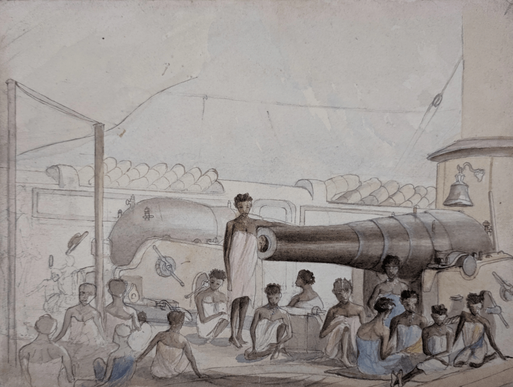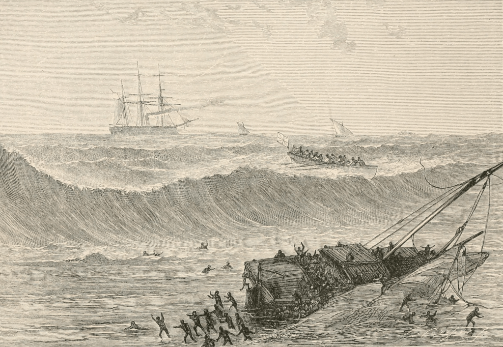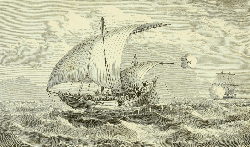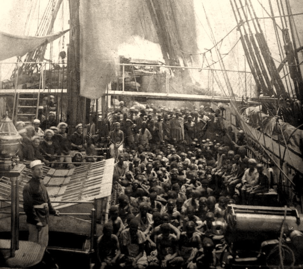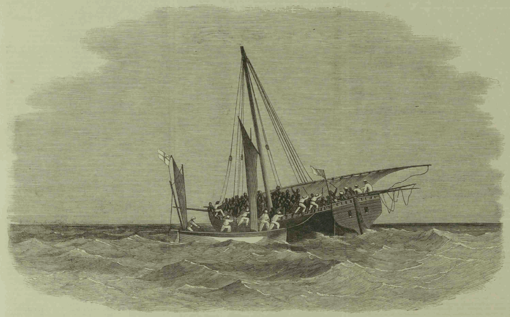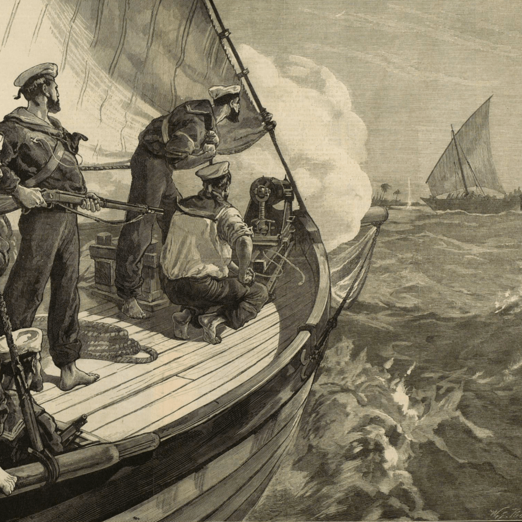 Il ne s’agira probablement pas du genre d’Amazones auxquelles vous pourriez vous attendre, mais des corvettes à vapeur HMS Daphne, Dryad et Nymph de la classe Amazon. La « chasse » dont il est question a eu lieu sur les côtes Est-africaines, où la Royal Navy intervenait activement pour faire cesser le commerce d’esclaves.
