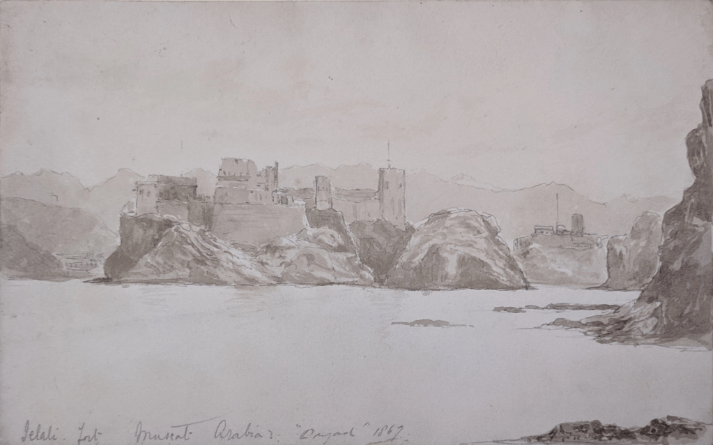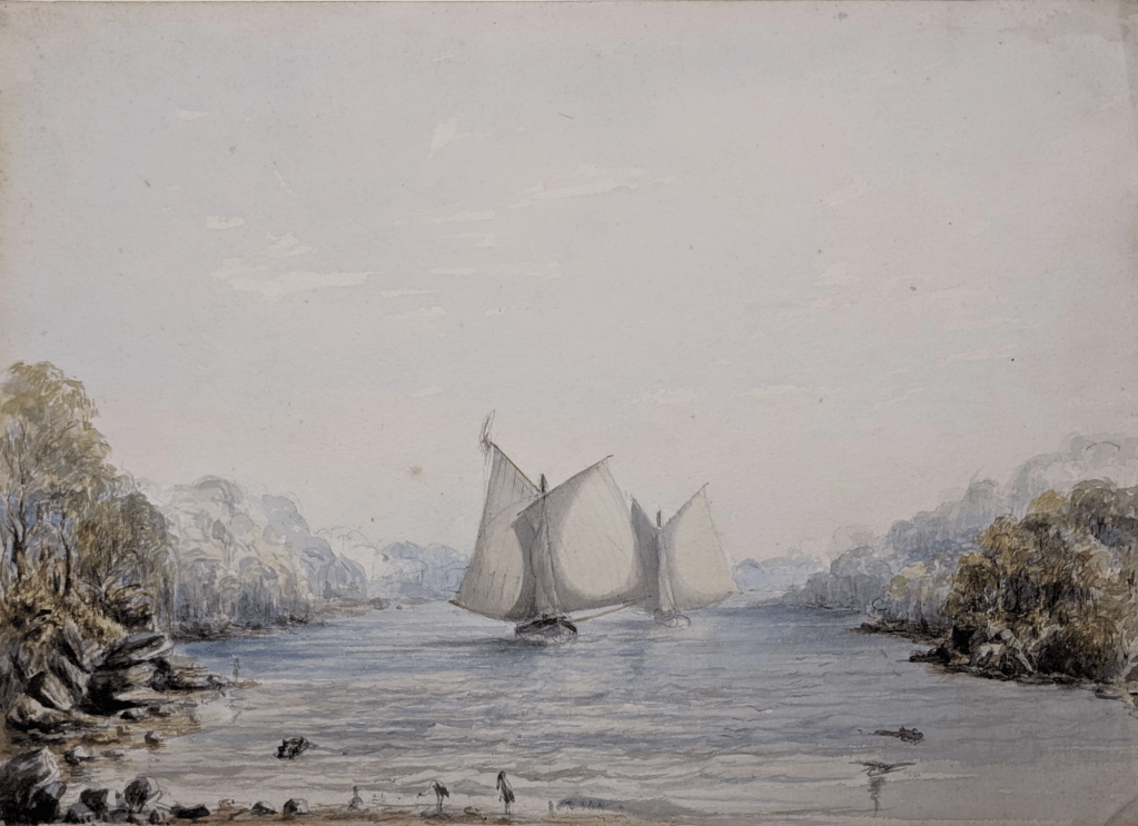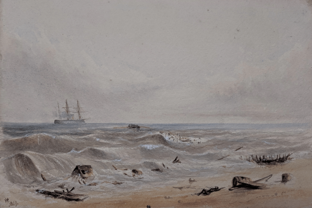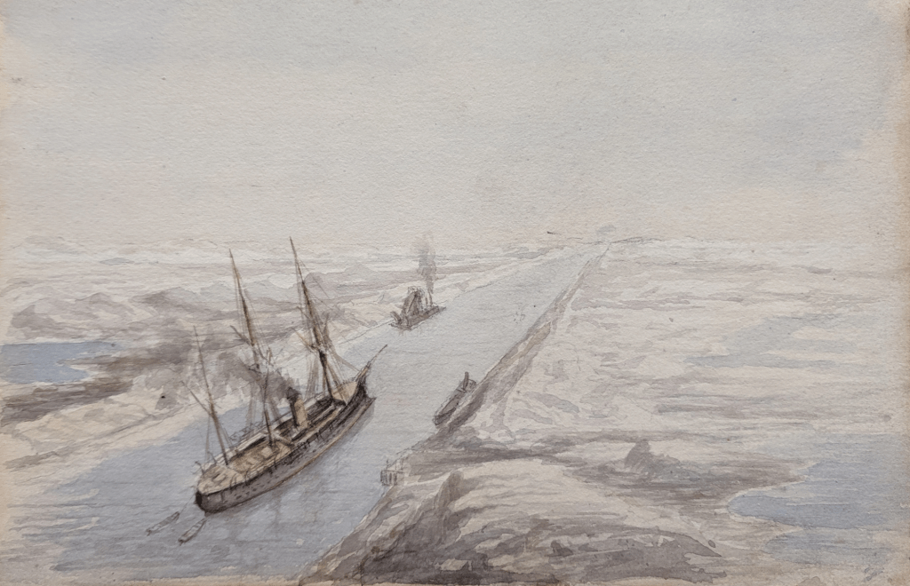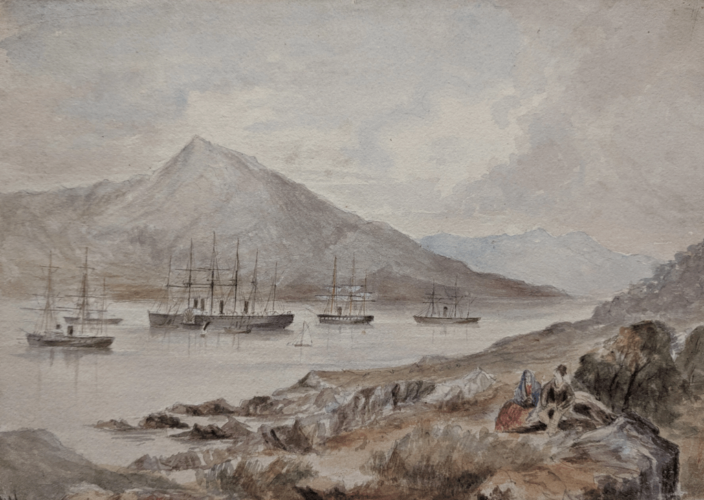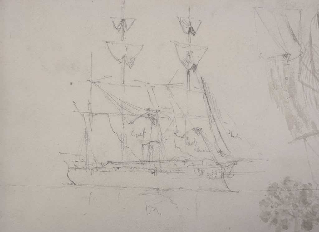 Je me suis intéressée à cette histoire à l’occasion du transfert vers les collections du Mariners’ Museum d’un album d’aquarelles et de croquis, contenant trente-sept illustrations que nous devons au Lieutenant William Henn de la Royal Navy. Ce nom sera familier aux amateurs de l’histoire de l’America’s cup : Henn et sa femme Susan ont concouru lors de l’édition de 1886 contre le Mayflower sur leur cotre de 90 tonnes Galatea, qui était aussi leur domicile !