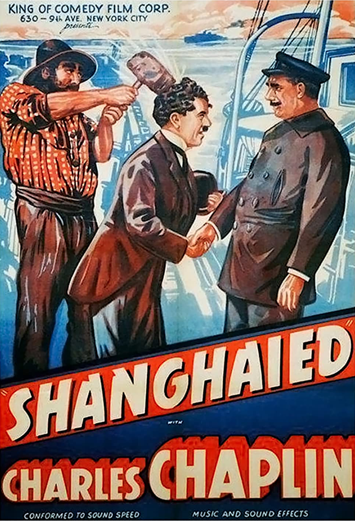 Enfin, le cinéma vient à la comédie avec les célèbres films de Charlie Chaplin et son incontournable personnage Charlot. Ce dernier devient marin malgré lui dans le court métrage « Shanghaied » (Charlot marin pour le public français), film burlesque de près d’une demi-heure qui dépeint un armateur cherchant à faire sombrer son navire afin de toucher la prime d’assurance. L’opération est toutefois confiée à Charlot qui, on l’imagine, va faire échouer les plans de son patron, et va finalement s’enfuir avec la fille de ce dernier.
