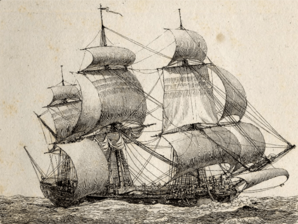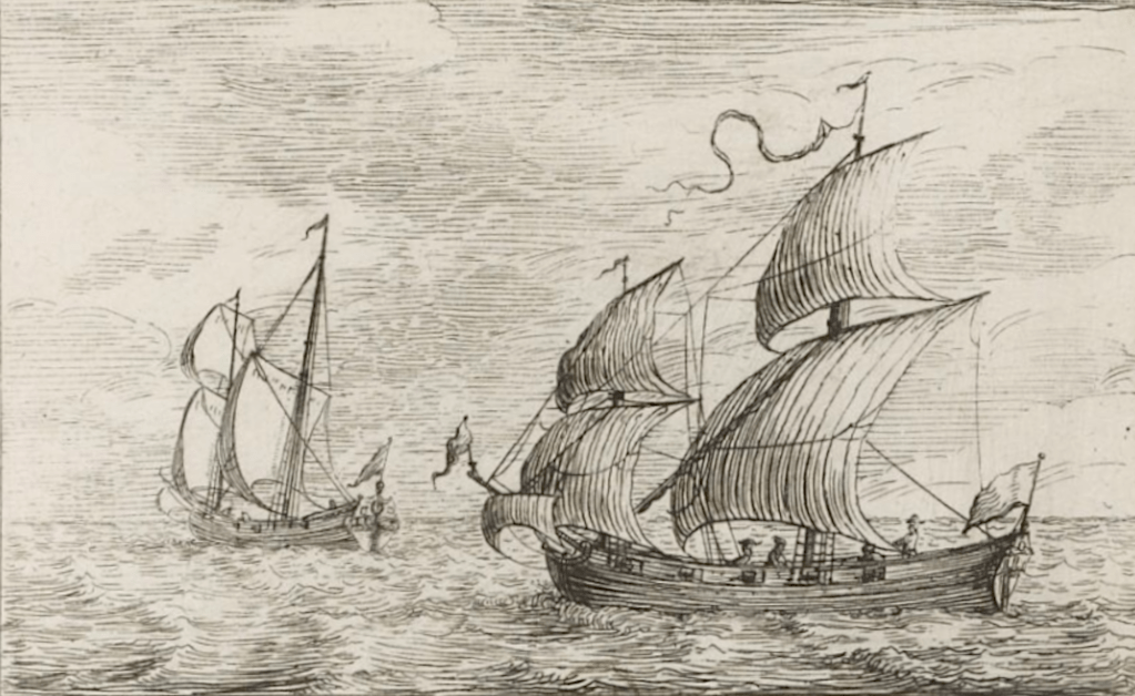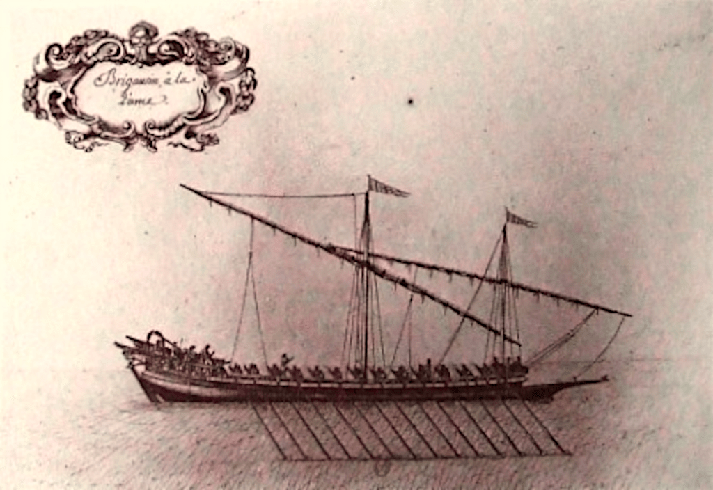 On se rapproche de la frégate moderne avec la « barque-vaisseau » également illustrée par le dessinateur Pierre Jacob Gueroult du Pas. Ce bâtiment est décrit comme « ayant le corps d’une barque longue et le gréement d’un vaisseau ». Il est en effet gréé en trois-mâts carré, avec le complément d’un mât d’artimon pourvu d’une voile latine.