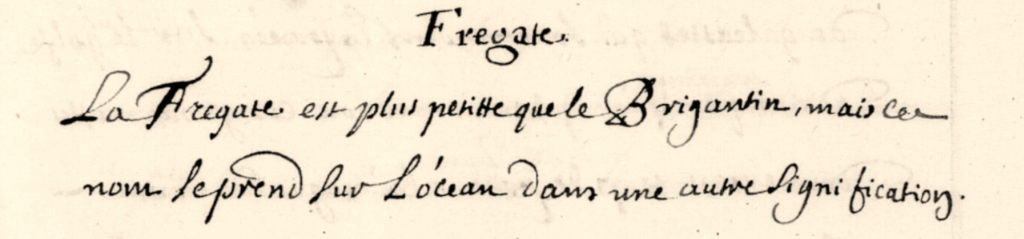 La « frégate » est particulièrement ancienne, mais désigne initialement des navires très différents de ceux auxquels on pense instinctivement. Le terme est employé dès le XVIème siècle pour faire référence à de petits navires proches des galères, pourvus d’avirons et portant une seule voile latine, employés en Méditerranée. La frégate est ainsi définie à la fin du XVIème siècle comme une « espèce de vaisseau de mer long et armé, moindre que le brigantin, qu’on mène ordinairement à la suite des galères pour envoyer découvrir et porter nouvelles en diligence çà et là ». Les dictionnaires de l’époque rapprochent simplement la frégate du « bateau » ou « barque », en latin Celox. C’est donc encore une embarcation particulièrement modeste qui ne saurait être considérée comme un véritable navire de guerre. S’il est également fait mention en 1570 de « frégates couvertes » employées sur le Rhône, il ne s’agit probablement pas pour autant d’un pont mais d’une simple protection pour les marins.
