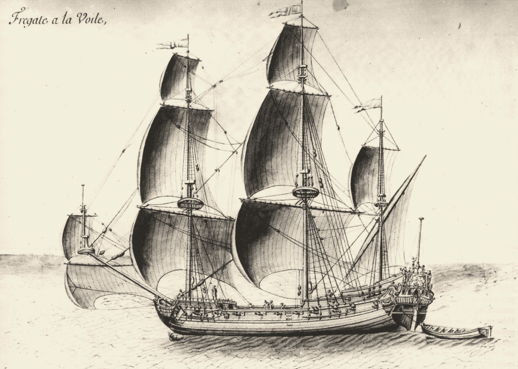 Loin de la galiote méditerranéenne, la frégate du Nord de la France est ainsi un navire de haute mer, ponté et pourvu de pièces d’artillerie placées en sabords, parfois assez lourdement armé. Antoine Biet reporte en 1652 la rencontre de trois vaisseaux français avec une « frégate d’Angleterre chargée pour le moins de 40 pièces de canon, ayant le vent en poupe ». Croyant avoir affaire à des navires marchands, l’équipage de cette frégate réalise son erreur et s’éloigne rapidement. On apprend au passage que cette frégate est bien pourvue de voiles carrées, abaissant son hunier en signe de respect devant les vaisseaux rencontrés.