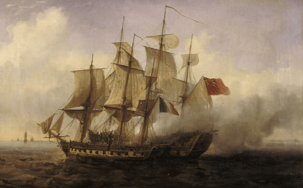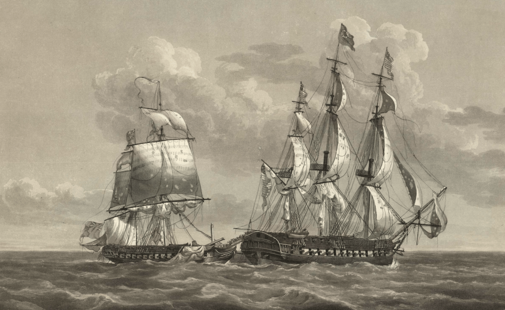 La frégate gagne en puissance de feu à la fin du XVIIIème siècle. On lance à partir des années 1780 des navires portant 26 à 28 canons de 18 livres. Ce sont ces « frégates de 18 » qui livreront les combats des guerres de la Révolution et de l’Empire. On construira même entre 1797 et 1799 les 4 premières frégates de la Marine française portant des pièces de 24 livres. Outre-Atlantique, le Naval Act de 1794 autorise également la construction des six premières frégates de l’US Navy, pourvues de pièces de 24 livres. L’une d’entre elles, l’USS Constellation, capturera la frégate française L’insurgente le 9 février 1799, dans le cadre de la « quasi-guerre », conflit larvé entre la France et les Etats-Unis. La plus célère reste toutefois l’USS Constitution, surnommée Old ironsides, qui s’est illustrée au large de la Tripolitaine pendant la première guerre de Barbarie (1801-1805) puis contre la Royal Navy au cours de la guerre de 1812. Ce bâtiment emblématique de la Marine des Etats-Unis est aujourd’hui encore à flots à Boston.