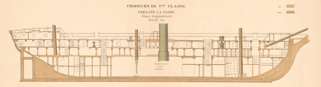 On commande encore ces navires depuis la dunette, plateforme élevée sur l’arrière du bâtiment au-dessus du pont de gaillards qui est devenu un pont continu. On a depuis cette dunette une bonne vue d’ensemble de l’état de la voilure. Mais la propulsion mécanique et l’allongement des navires va imposer des transformations qui préfigurent les bâtiments modernes : une « passerelle » est installée à mi-navire comme sur le plan de la Flore ci-dessus ou la vue de la Sémiramis ci-dessous.