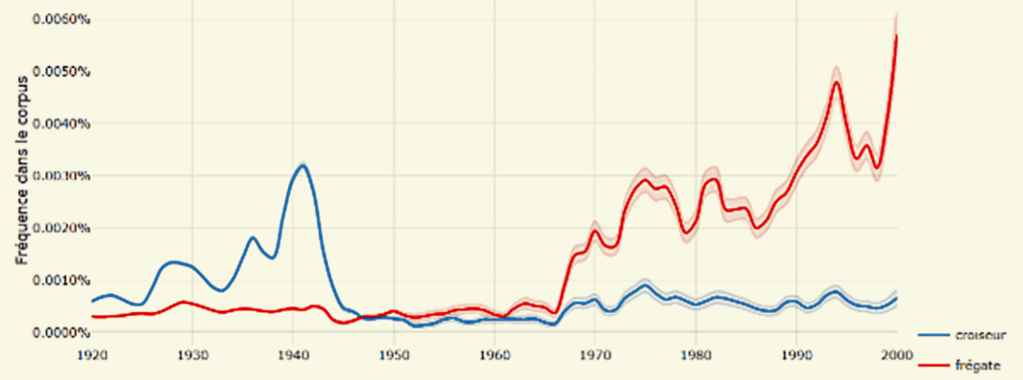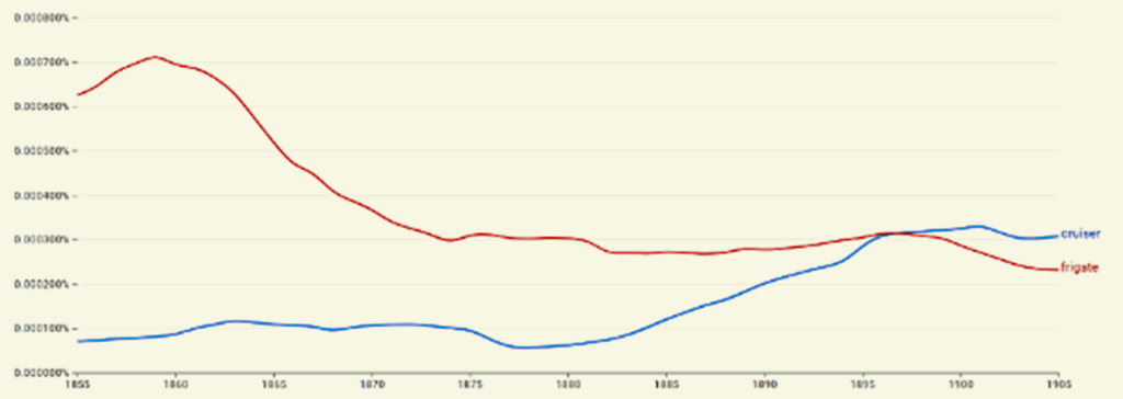Sémantiquement, le croiseur succède rapidement à la frégate. On préfère désormais des vocables renvoyant clairement à la mission opérationnelle des navires à des termes désuets hérités de la Marine d’Ancien Régime, qui n’ont plus vraiment de sens tactique. La frégate va dès lors entamer une longue traversée du désert.