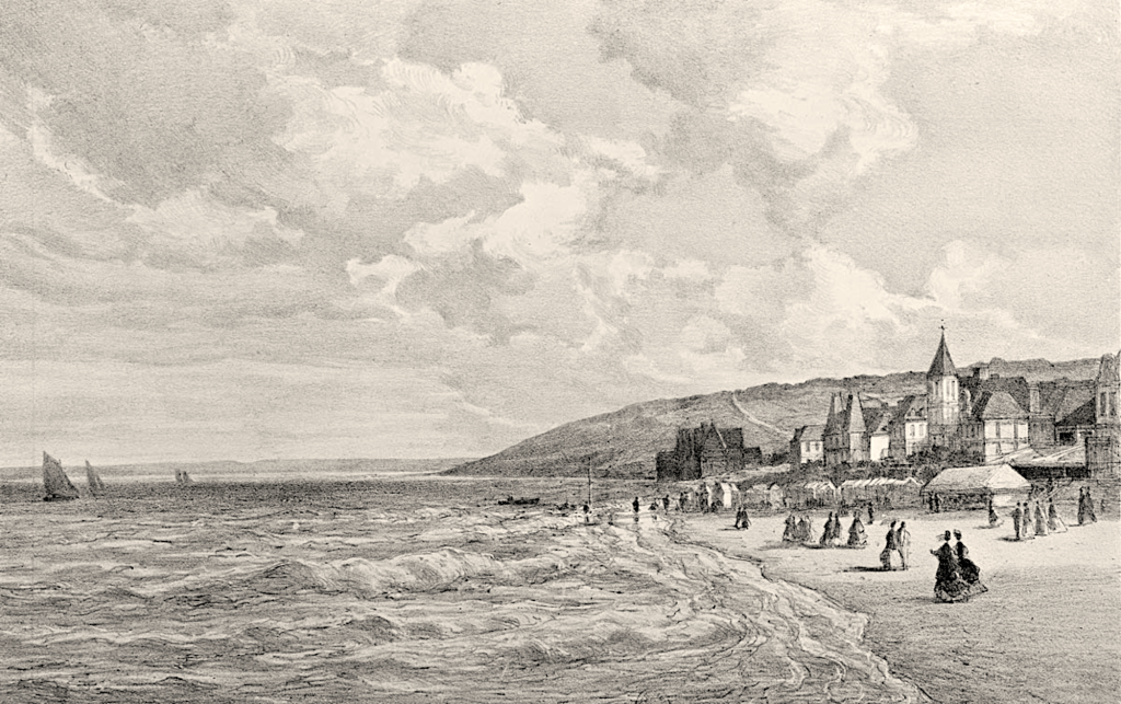Un autre tableau peint par Léon Asselineau (1808-1889) intitulé Panorama de Trouville montre bien que le chenal d’accès au port de Trouville était protégé par des jetées en bois. A gauche toujours cette même colline verdoyante et en pente douce. Nous retrouvons bien ce détail sur le tableau de Gallard-Lépinay.