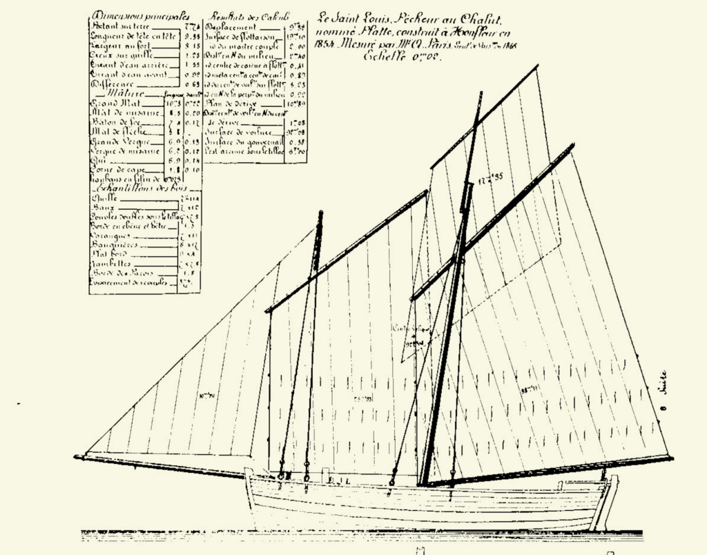 Le bateau au centre du tableau portant une misaine rouge, tout comme celui qui manœuvre pour entrer dans le port avec ses voiles blanches, sont des plattes de Villerville avec un gréement de flambart. Bateau typique du quartier de Honfleur et reconnaissable à ses deux mâts avec une misaine tiercée, une grand voile aurique et un hunier volant visible sur le bateau entrant dans le port. Les plattes sont utilisées pour la pêche au chalut et il est intéressant de noter que Gallard-Lépinay n’a pas omis de représenter ce détail parfaitement visible sur le chalutier du centre. La vergue du chalut est à poste sur le bord du bateau et le cul du filet crocheté à un palan frappé en tête du grand mât. Il est aussi en train de hisser sa grand voile. Focs et hunier volant ne sont pas encore établis.
