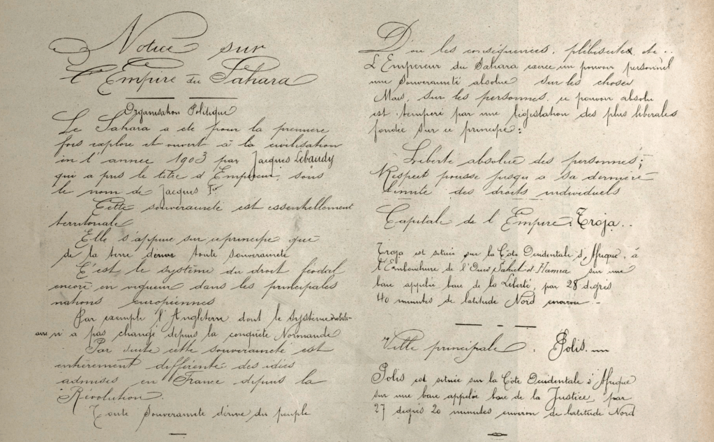 En attendant la concrétisation de ce vaste programme, Lebaudy précise aux hippodromes européens que les chevaux du haras impérial de Troja seront inscrits sous le nom de Sa Majesté Jacques Ier, empereur du Sahara, et annonce au Yachting Club de France que ses navires battront pavillon du Sahara, trois étoiles d’or sur champ azur.