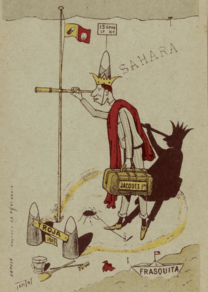 Il ne s’agit rien de moins que de s’installer dans le Sahara pour y fonder son propre Etat. Lebaudy s’intéresse tout particulièrement à une mince bande de terre s’étendant du Cap Juby, au Sud du Maroc, au cap Bojador, au Nord du « Rio de Oro », l’actuel Sahara occidental alors sous contrôle espagnol. Ce petit territoire présenterait l’avantage de relier l’Océan Atlantique à la Mauritanie sous protectorat français. Cependant, bien que cette souveraineté ne soit pas fermement établie, cette région est de facto sous contrôle de l’Espagne, qui verrait comme une intrusion injustifiée toute initiative dans les parages. On l’imagine également au grand déplaisir du Maroc, qui pourrait se sentir menacé par un nouveau voisin, mais également des tribus maures occupant ancestralement les lieux. Mais il faut plus que le risque de mécontenter l’Espagne et le Maroc pour arrêter Jacques Lebaudy.