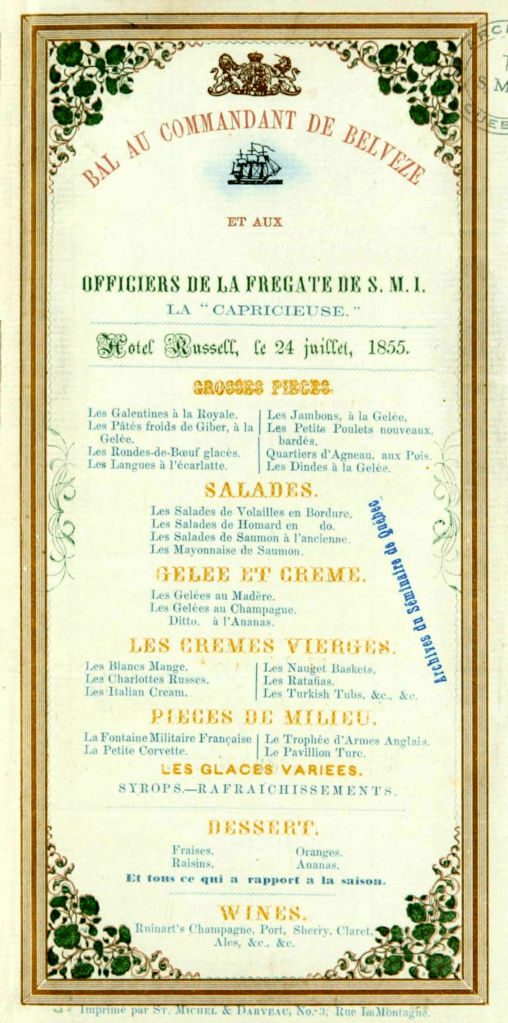 On donne le 19 juillet un bal sur la terrasse Durham, sous la citadelle, surplombant la ville de Québec. L’assistance est des plus variées, Britanniques, Canadiens français, descendants des Hurons et Abénaquis en habits traditionnels. La soirée est riche en surprises comme le rapporte un officier français : « le ciel tapissé d’étoiles brillait de lueurs électriques, quand les mâts et les agrès de notre corvette s’illuminent tout-à-coup, ses bastingages dans toute leur longueur se couvrent de feux du Bengale et laissent entrevoir son élégante carène, brillante comme si elle avait été vernie la veille ; c’était un ravissant coup d’œil, un vrai tableau de nuit embelli par le reflet des eaux limpides du fleuve. […] Mais ce spectacle n’était qu’une dérision comparativement à celui que le ciel, qui semblait toujours se mêler à nos joies, nous préparait. En effet, tout-à-coup depuis l’horizon jusqu’au zénith, des myriades de gerbes de feu prenant tantôt les couleurs de l’arc-en-ciel, tantôt celles d’une blancheur opale ou phosphorescente, enveloppèrent le firmament presque tout entier, obscurcirent les pavois de notre navire et nous laissèrent croire un instant que le soleil avait précipité sa course : toutes ces gerbes aux mille couleurs lumineuses, plus vives, plus chatoyantes que celles des robes satinées et glacées des danseuses, se confondaient, allaient, venaient toujours perpendiculairement de l’horizon au zénith, dansaient enfin, comme pour nous inviter à reprendre nos quadrilles : c’était une aurore boréale. Depuis 1836 Québec n’en avait pas vu d’aussi brillante, […] ce qui ne manque pas de faire dire autour de nous qu’il fallait notre venue au Canada pour qu’une pareille clarté vint illuminer la capitale de ses célestes et lumineux rayons ».
