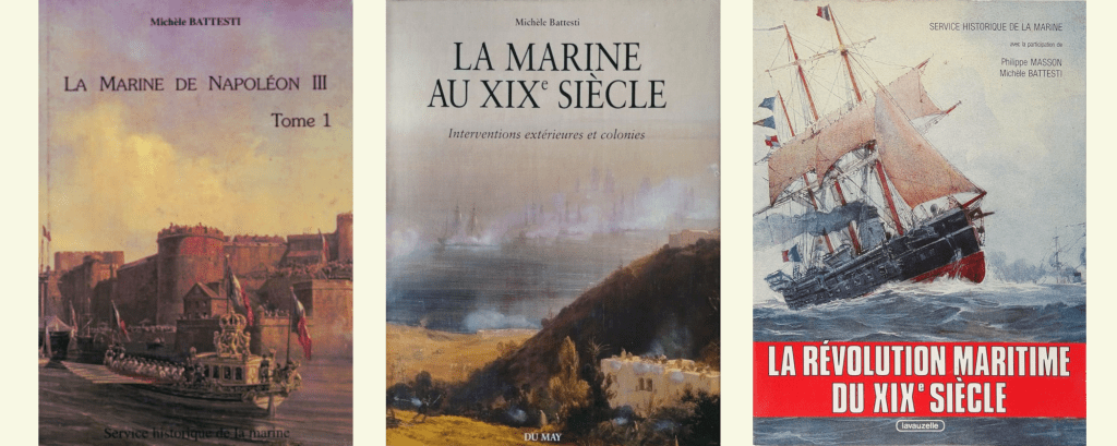 Nous ne saurions assez vous recommander de découvrir les ouvrages de Michèle Battesti. Les deux remarquables tomes de La Marine de Napoléon III : une politique navale, qui deviennent difficiles à trouver aujourd’hui, sont issus de sa thèse de doctorat en Histoire soutenue en 1996. Michèle Battesti a également publié La Marine au XIXe siècle, interventions extérieures et colonies, se concentrant cette fois sur le sujet des opérations navales françaises. Enfin, rédigé en collaboration avec Philippe Masson, un bel ouvrage de synthèse : La Révolution maritime du XIXe siècle, parfaite entrée en matière pour découvrir les incroyables innovations de ce siècle.