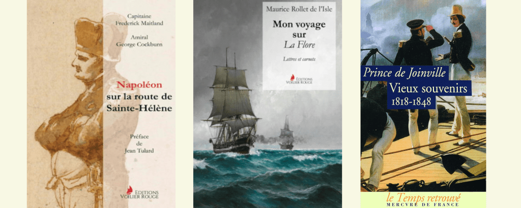 Rien de mieux pour découvrir la vie des marins du XIXe et des pages d’Histoire singulières que de lire les récits de l’époque. C’est ce que proposent notamment les récentes éditions Voilier Rouge, avec lesquelles nous avons le plaisir de travailler, et qui ont proposé dernièrement avec Napoléon sur la route de Sainte-Hélène une édition inédite des récits de l’exil de l’Empereur déchu par le Captain Frederick Maitland, commandant le HMS Bellerophon, et l’amiral George Cockburn qui accompagne Bonaparte sur le Northumberland. Dans un tout autre style, tout en humour et en illustrations, vous pourrez aussi embarquer avec un élève officier sur la Flore pour la campagne d’application des aspirants de Marine en 1881 avec Mon voyage sur la Flore dont nous avons contribué à l’édition. Enfin, nous vous recommandons chaudement la lecture aux éditions Mercure de France des Vieux souvenirs du Prince de Joinville, fils du Roi Louis-Philippe, qui vous ferons découvrir la Marine sous la Monarchie de Juillet.