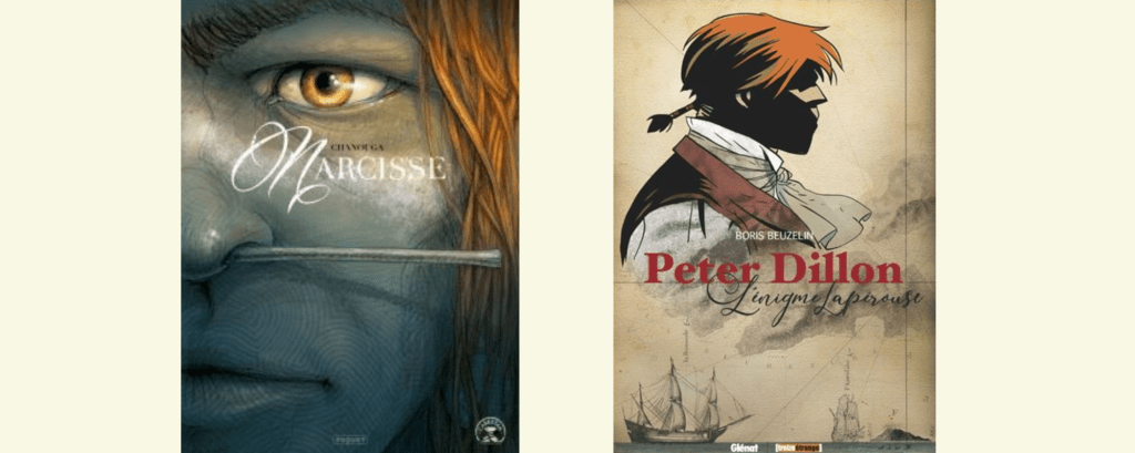 Nous retrouvons avec plaisir Chanouga avec Narcisse, l’histoire incroyable de Narcisse Pelletier, marin français naufragé en Nouvelle-Guinée qui sera retrouvé dix-sept ans plus tard, parfaitement accoutumé à la vie des aborigènes qui l’accueillirent. Cruel destin que celui du « sauvage blanc » qui sera ainsi arraché à sa vie et à ses proches à deux reprises. Vous pourrez retrouver les îles du Pacifique avec Peter Dillon, l’énigme Lapérouse, pour suivre le voyage de l’explorateur irlandais né en Martinique qui retrouva en 1827 les traces de l’expédition de La Pérouse à Vanikoro.