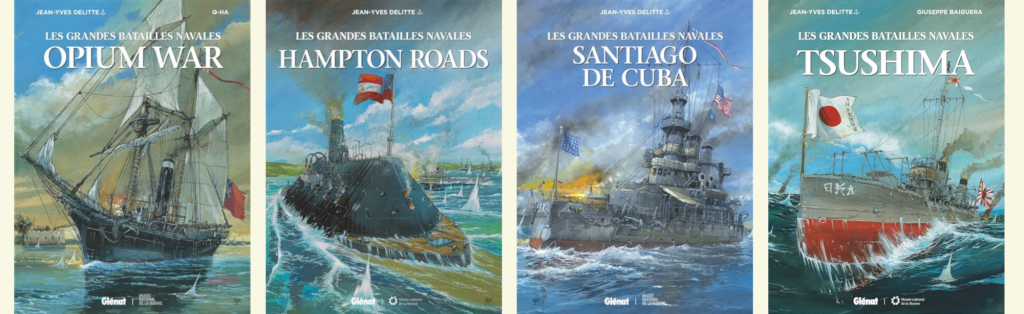 Toujours en bande dessinée, la collection des Grandes Batailles Navales conduite par le peintre officiel de la Marine Jean-Yves Delitte est rapidement devenue incontournable. Plusieurs albums dépeignent magnifiquement des affrontements majeurs du XIXe et du début du XXe siècle : l’intervention britannique en Chine avec le récent Opium war, le premier affrontement entre cuirassés à Hampton Roads, la guerre hispano-américaine de 1898 avec la bataille de Santiago de Cuba, et l’éclatante victoire de la flotte impériale japonaise sur l’escadre russe à Tsushima en 1905. Nous espérons en voir plus et admirer un jour les batailles d’Heligoland (1864) ou de Lissa (1866) dans la même collection !