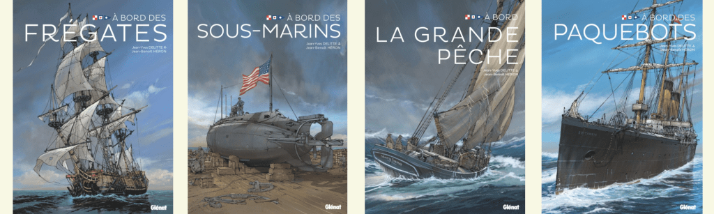 Toujours avec Jean-Yves Delitte, en collaboration avec Jean-Benoît Héron, la série « à bord » vous fait découvrir en images l’évolution des frégates, des sous-marins, des navires de la grande pêche et des paquebots. Une collection incontournable pour les amateurs d’histoire maritime.