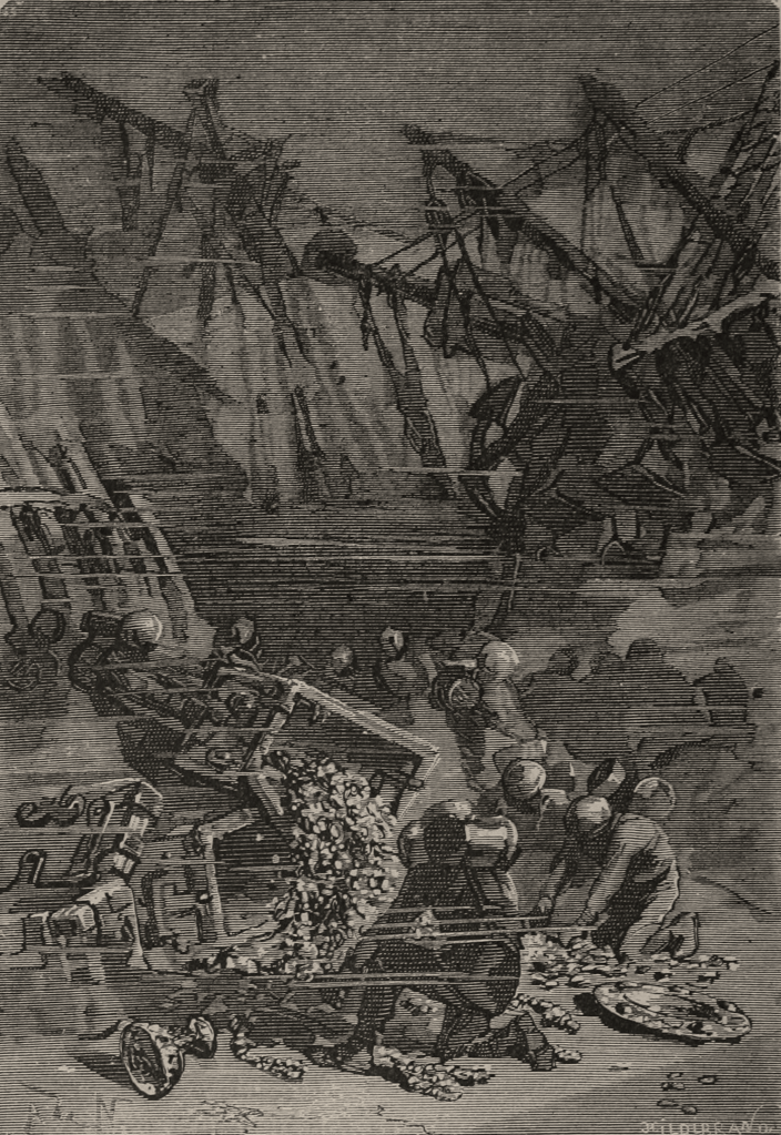 Autour du Nautilus, dans un rayon d’un demi-mille, les eaux apparaissaient imprégnées de lumière électrique. Le fond sableux était net et clair. Des hommes de l’équipage, revêtus de scaphandres, s’occupaient à déblayer des tonneaux à demi pourris, des caisses éventrées, au milieu d’épaves encore noircies. De ces caisses, de ces barils, s’échappaient des lingots d’or et d’argent, des cascades de piastres et de bijoux. Le sable en était jonché. Puis, chargés de ce précieux butin, ces hommes revenaient au Nautilus, y déposaient leur fardeau et allaient reprendre cette inépuisable pêche d’argent et d’or.