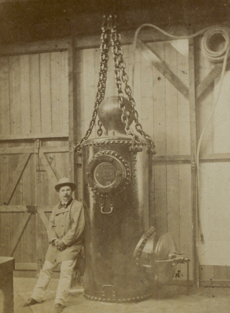Le peintre et photographie Jean-Baptiste Henri Durand-Brager (1814-1879) fait lui-aussi partie de l’expédition. Il décrit la sensation d’une plongée dans cet appareil :