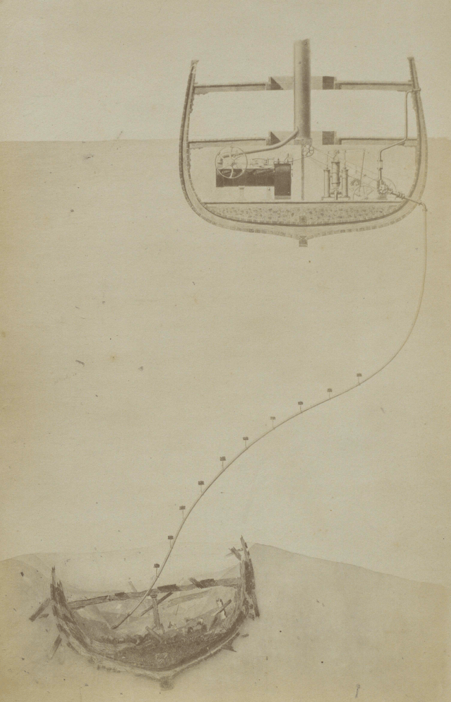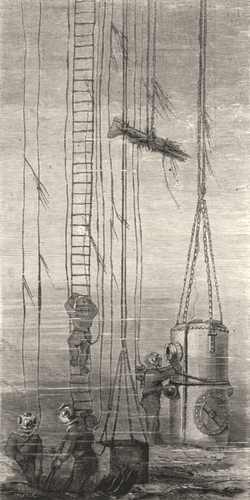 Une équipe de plongeurs est également équipée de « scaphandres autonomes », conçus par Benoît Rouquayrol et le lieutenant de vaisseau Auguste Denayrouze. Le dispositif, également illustré dans le roman de Jules Verne, est pourvu d’une soupape permettant l’alimentation à la demande en air respirable depuis un réservoir cylindrique porté sur le dos du plongeur. L’appareil permet de travailler jusqu’à trois heures à une profondeur d’une cinquantaine de mètres. Il a été présenté au grand public à l’occasion de l’Exposition universelle de Paris en 1867, à l’occasion duquel ses concepteurs ont reçu une médaille d’or. Onze épaves sont localisées grâce à cet équipement de pointe au cours des trois premiers mois d’exploration.