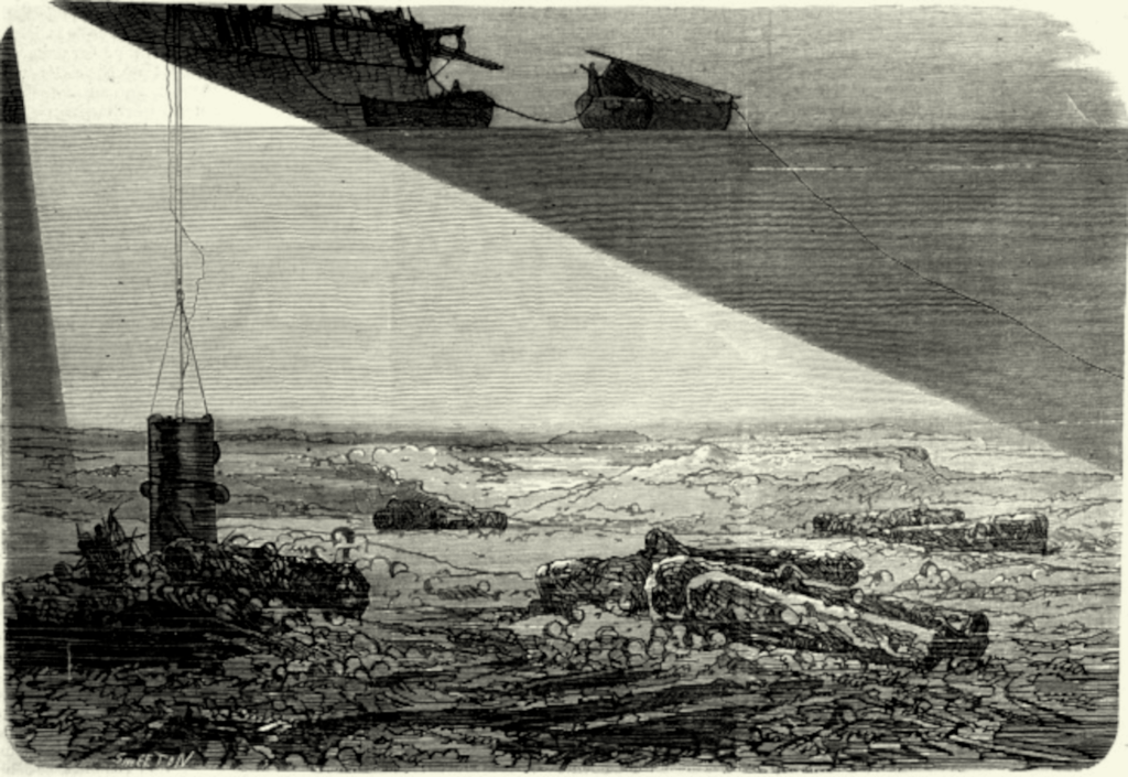 C’est une véritable nécropole de vaisseaux. Ici, des tas de boulets, corrodés et couverts de productions aquatiques ; là, des groupes de canons pêle-mêle, enchevêtrés dans des masses de coquilles, de ferrailles et des débris de toutes sortes. Ailleurs, ce sont des espèces de tumulus dont la forme accuse quelques débris enfouis dans le sable. Tout cela se distingue comme en plein soleil ; les plus petits détails étaient perceptibles à ce point que le sifflet du capitaine, jeté par-dessus le bord, fut immédiatement remonté par un plongeur ».