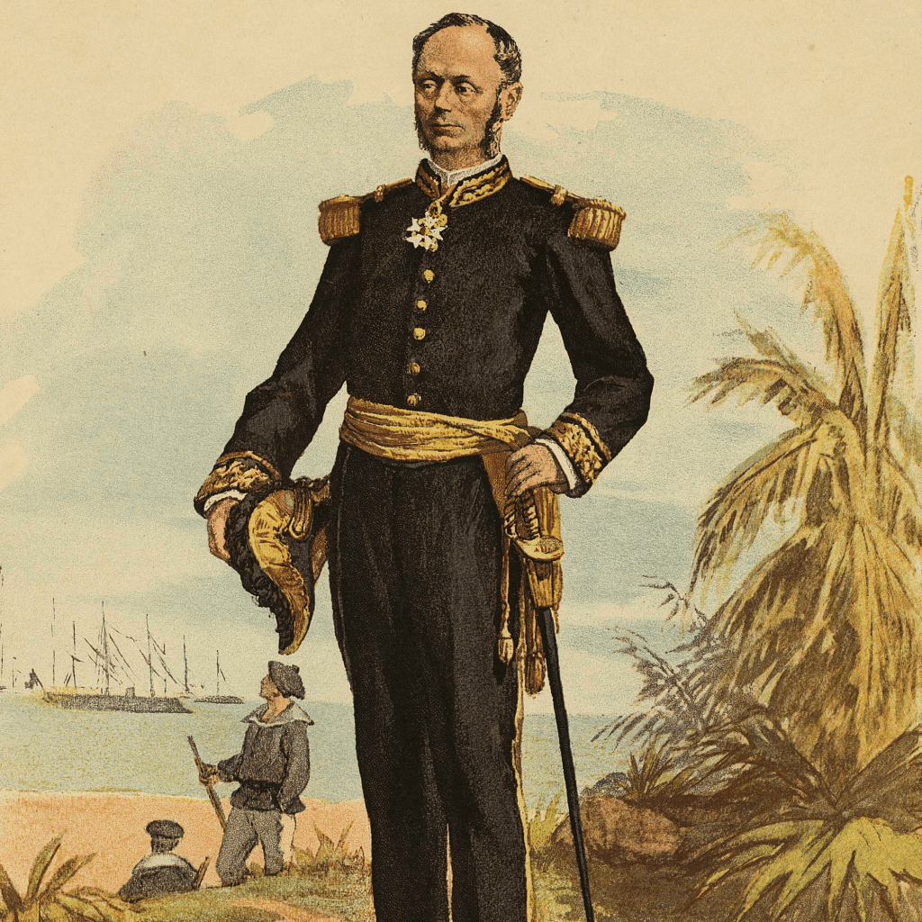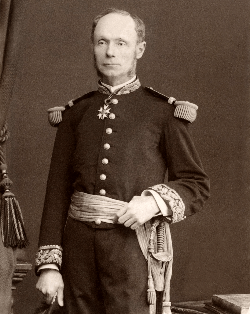 Après une brillante carrière embarquée, Courbet fut nommé gouverneur de la Nouvelle-Calédonie, qu’il rejoignit en août 1880. Il fut par la même occasion promu contre-amiral et changea par conséquent d’épée, comme le montre le portrait réalisé en 1883 par le photographe Ernest Appert (1831-1890). L’épée photographiée à la ceinture de l’amiral semble suivre l’usage observé depuis le Second Empire, les amiraux portant des épées inspirées du modèle introduit en 1853 pour les officiers de l’administration centrale de la Marine, à la différence notable de la poignée réalisée en écaille et non plus en nacre. Ces épées sont plus richement ornementées que celles des officiers subalternes et supérieurs, la branche et la monture sont notamment étalinguées. Il est difficile de distinguer sur cette photographie si les deux étoiles du contre-amiral figurent bien sur le clavier, mais il semble que cela soit le cas. L’aigle figurant sur le pommeau des officiers d’amiraux sous le Second Empire a très probablement été remplacé par une coquille Saint Jacques.