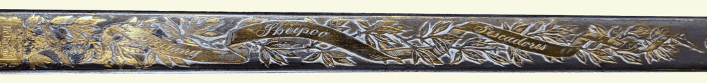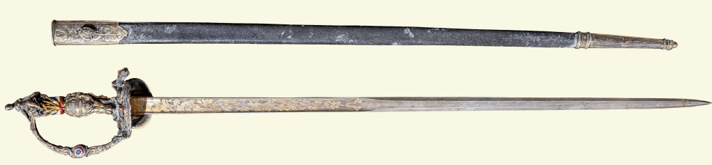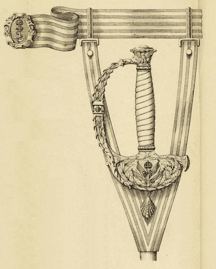 L’épée serait dans ce cas conforme au modèle défini par le décret du 29 janvier 1853 déterminant l’uniforme des différents corps de la Marine. L’épée modèle 1853 est similaire au modèle déjà réglementé en 1837, remplaçant simplement par une couronne impériale la couronne royale, qui avait disparu en 1848.