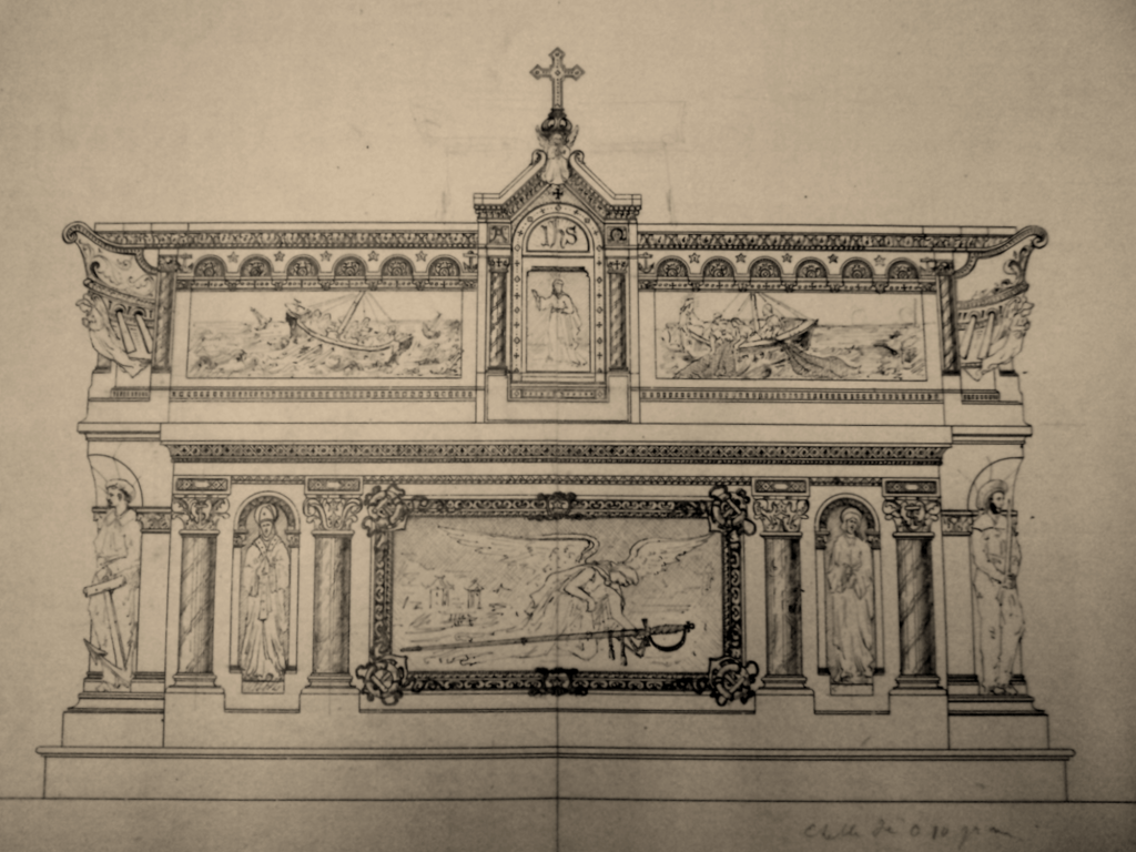 L’épée fut remise à la Basilique à l’occasion d’une messe célébrée pour le repos de l’âme de l’amiral le 22 décembre 1887. L’archevêque Richard la confia à l’amiral Gicquel des Touches, qui présidait semble-t-il le Comité de la chapelle de la Marine. L’épée devait être intégrée dans un avant-projet de soubassement de l’autel, sur lequel un ange devait se trouver agenouillé et porter l’arme d’une main. Remarquons qu’il ne s’agissait pas sur cette représentation précoce de l’épée portée par l’amiral en Chine, le dessinateur n’ayant peut-être pas connaissance à cette date de l’épée qui devait prendre place sur l’autel.