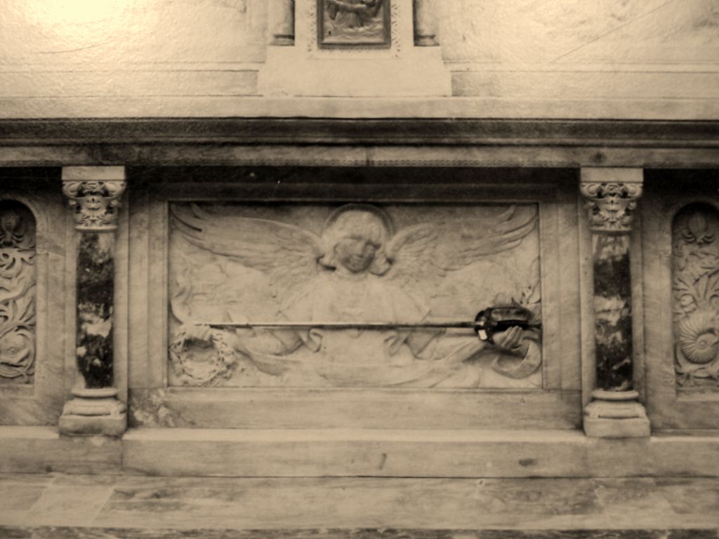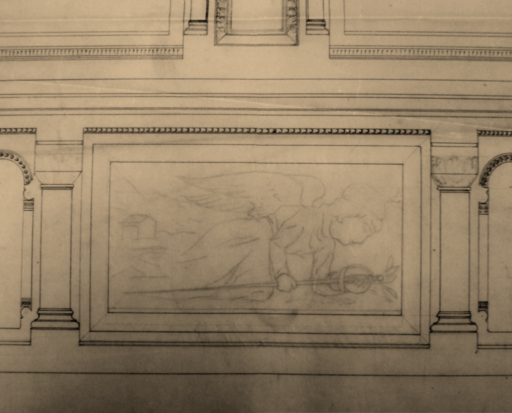 Nous remarquons qu’une disposition différente a finalement été retenue pour ce bas-relief : l’ange est représenté en buste et de face, soutenant l’épée de ses deux mains. Cette disposition apportait probablement un meilleur soutien à l’épée, qui était disposée lame nue, sans son fourreau et sans dragonne. L’épée resta à cet emplacement près d’un siècle avant d’être volée en 1980. Cet acte inqualifiable est lourd de conséquences : les épées et sabres de la Marine française ne portent que très rarement de gravures indiquant le nom de leur propriétaire d’origine. Si les épées d’amiraux de ce style sont rares, elles ne sont pas exceptionnelles, et sans indication de la provenance de l’arme, il serait pratiquement impossible d’identifier formellement aujourd’hui l’épée de l’amiral Courbet si elle venait à réapparaître.