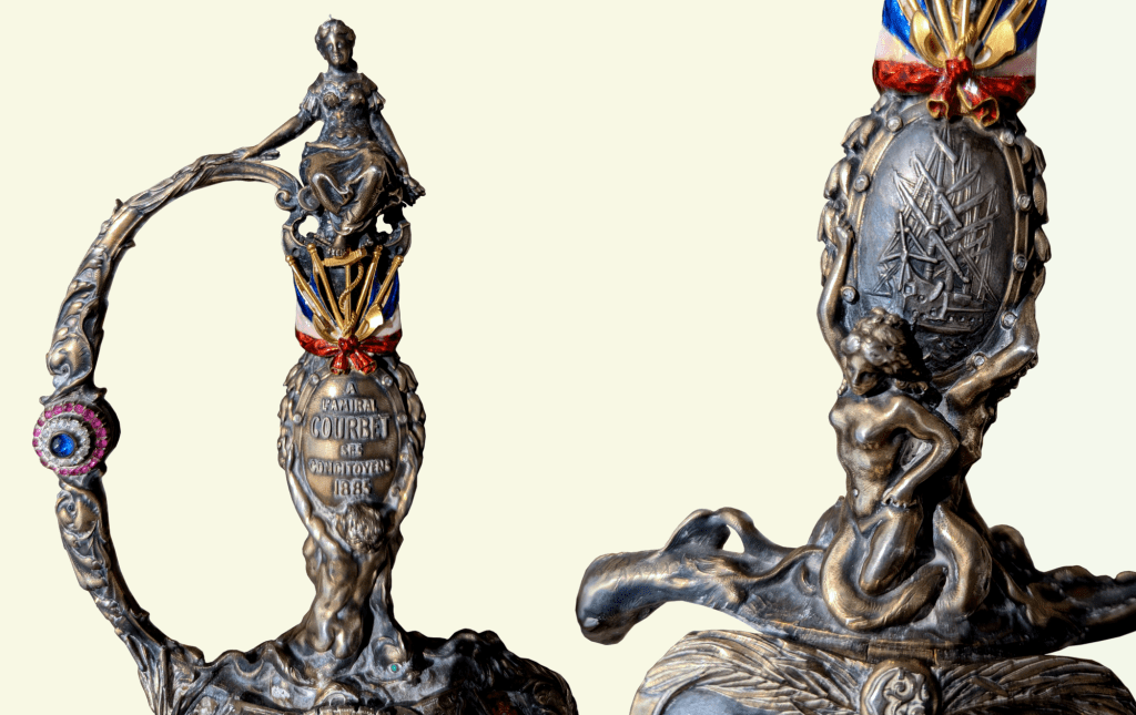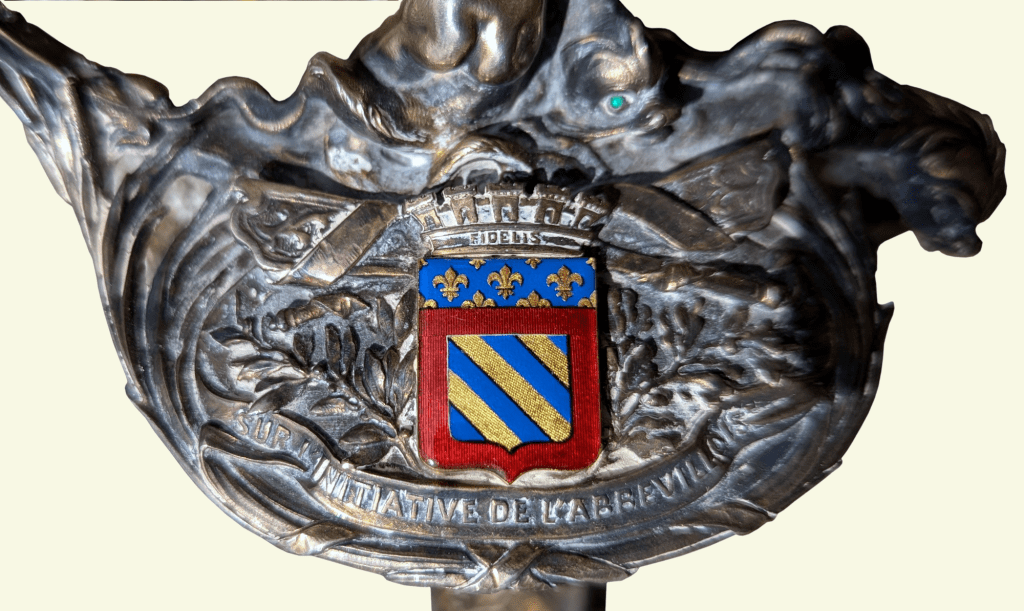 Nous avons enfin retrouvé la trace d’une dernière épée, offerte par la mairie d’Abbeville à la famille de l’amiral Courbet après la mort de ce dernier, en commémoration de ses victoires au Tonkin. Œuvre du fourbisseur Froment-Meurice, l’élégante monture fut assemblée sur une lame de Tolède. Cette épée fût plus tard cédée parmi d’autres effets de l’amiral au musée d’Abbeville et du Ponthieu. Un catalogue des collections du musée en fit la description en 1902 : « Elle porte sur la lame les inscriptions suivantes : le Bayard, puis la liste de ses principales victoires : Thuan-an, Sontay, Fou-Tchéou, Kelung, Sheipoo, Pescadores. La garde, enrichie de pierres précieuses, porte les armes de la ville avec cette inscription : A l’amiral Courbet, ses concitoyens ; et sur la sous-garde : A l’initiative de l’Abbevilloise ; au talon de la lame : Art de Toledo, anno 1885. Signé sous la coquille Froment-Meurice. La poignée en or de l’arme est formée par un groupe de Tritons et de Néréides supportant un écusson ovale entouré de brillants, sur les face duquel on voit d’un côté le vaisseau le Bayard, en relief sur argent, de l’autre l’inscription : A l’amiral Courbet, ses concitoyens, 1885. Au-dessous, une ancre entourée d’un faisceau de pavillons tricolores émaillés. Le tout est surmonté par deux rostres de galères au-dessus desquels est assise, formant le pommeau de l’épée, la France couverte d’une cuirasse et tenant de la main gauche des couronnes de laurier et de la droite une palme qui s’étend sur la garde de l’épée. Celle-ci est formée par deux dauphins entre les têtes desquels est une cocarde tricolore en rubis, diamants et saphirs, formant le centre de la garde. Sur la coquille encadrée de roseaux est posé, d’un côté, sur deux gouvernails croisés, l’écusson de la ville d’Abbeville entouré de chêne et de lauriers avec la devise : Fidelis ; de l’autre côté, au-dessous du chiffre de Courbet, sur deux palmes, est ciselé sur argent le combat de Fou-Tchéou. Le quillon de l’épée est constitué par un dauphin aux yeux d’émeraude ».