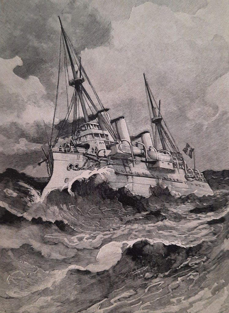 Peu à peu les derniers feux s’éteignent, et maintenant, sous la forte poussée de nos deux hélices, nous nous enfonçons dans le sombre horizon.