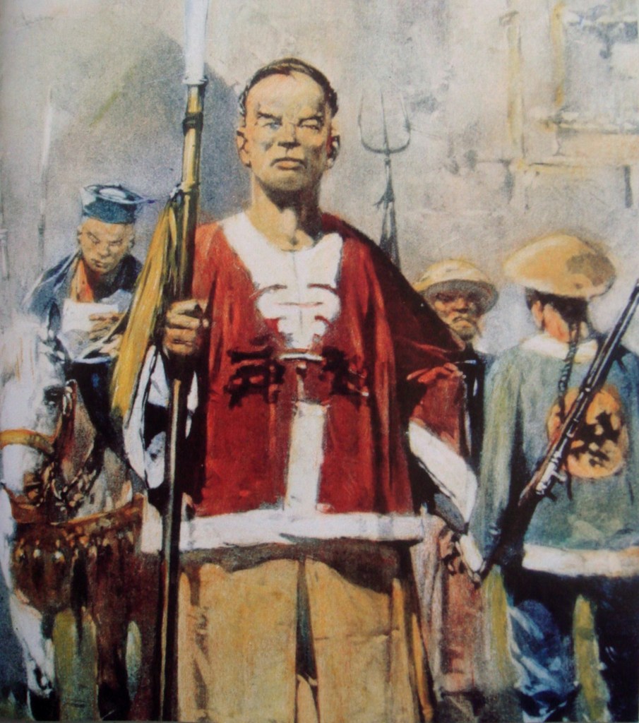 A 7 heures 20 du soir, on me prévient qu’une forte bande de Boxeurs se dirige vers nous. A 7 heures 25 les premiers arrivent devant la porte du sud, vêtus de grand turbans rouges et de ceintures rouges. Ils s’avancent lentement, la torche d’une main, le sabre de l’autre. Ils sont à trois cents mètres. Là, ils s’arrêtent, font des génuflexions ; ils prient Bouddha de les rendre invulnérables. Les voilà qui se lèvent ; ils s’avancent au pas gymnastique ; les voilà à deux cents mètres : « Joue ! A cent cinquante mètres, feu ! » Dix-sept balles fauchent les premiers rangs, qui s’abattent comme des capucins de cartes. « Joue, feu ! » Seconde salve, seconde fauchée. Quand la fumée est dissipée, la place est nette, à part quelques blessés, quelques égarés qui essayent de se sauver ; on les salue à coups de fusil. Un bonze, le chef de l’expédition sans doute, reçoit un coup de fusil ; il peut en chancelant gagner à un abri. Sur le terrain gisent une douzaine de cadavres. Nous sortons pour nous emparer leurs armes, et nous rentrons aussitôt munis de sabres et de lances. On a pu compter au moins seize morts, ce qui fera certainement une cinquantaine d’hommes hors de combat, en admettant la proportion de deux hommes blessés pour un homme tué.