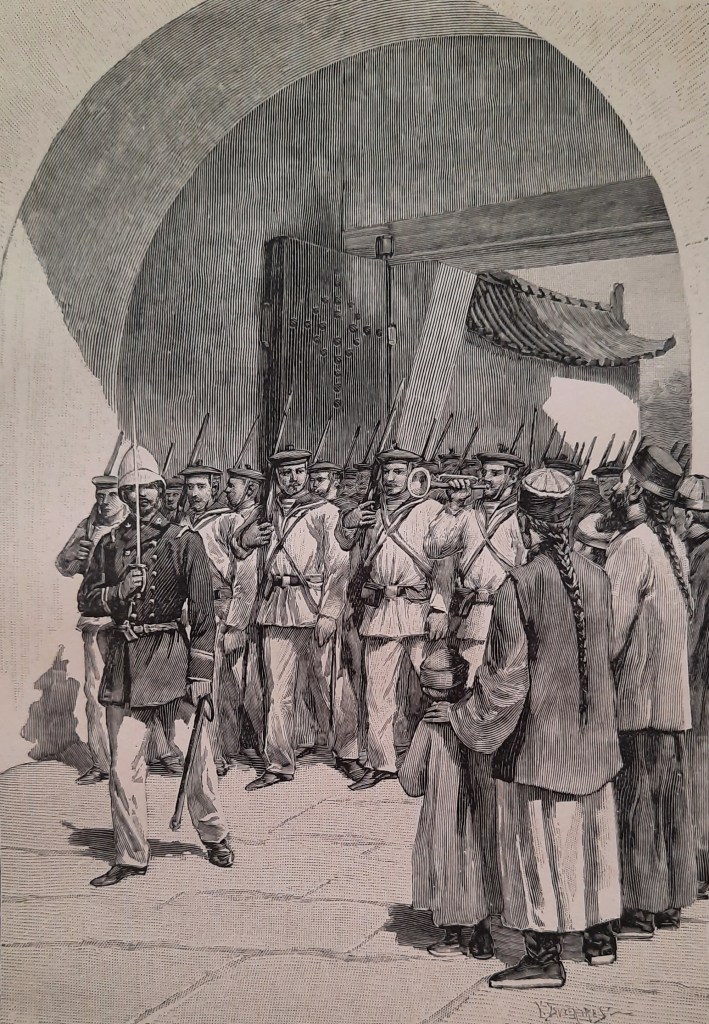 L’idée de l’enlever me paraissant praticable, je fais demander à Monseigneur Jarlin de m’envoyer une trentaine de Chinois de bonne volonté, avec des cordes et des madriers, pour nous prêter main forte. Monseigneur Jarlin arrive presque aussitôt avec une vingtaine de Chinois, mais sans instruments ; on perdrait un temps précieux à les chercher. Nous sortons, et rapidement nous nous avançons vers la porte, huit hommes en tirailleurs ouvrant la marche. Arrivés à la porte, nous sommes accueillis par une fusillade très nourrie : les Chinois se précipitent bravement sur le canon, en même temps que les marins prennent position pour les soutenir. Les soldats chinois, dissimulés dans les maisons, ouvrent un feu violent. Un chrétien chinois est tué raide, un autre est traversé de trois balles : les autres hésitent, il faut les relancer trois fois. Enfin, après des difficultés de toute sorte, et grâce aux chrétiennes exhortations de Monseigneur Jarlin, le canon, après avoir versé deux fois, est rapidement entraîné vers le Pé-T’ang ; les marins en tirailleurs protègent la retraite, qui se fait tranquillement, sans accident. Nos pertes sont relativement très faibles : je fais mettre le canon en batterie derrière le remblai, et fais envoyer aussitôt un boulet sur le poste d’où on nous a fusillés tout à l’heure.