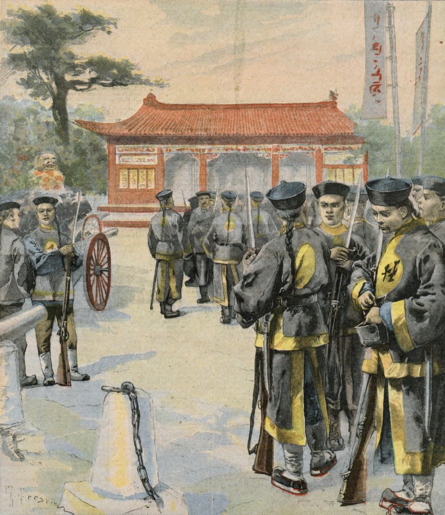 12 juin 1900. – Nouvelle assurance de paix. Le Tsong-li-Yamen a formellement permis de laisser entrer les renforts. Tout cela paraît un peu rapide comme réconciliation. N’y a-t-il pas quelque chose là-dessous ? Pas de nouvelles des détachements. C’est bizarre, ils devraient être à une vingtaine de kilomètres. Encore une alerte ce soir. Au moment où nous prenons le thé, on est venu me prévenir que les Boxeurs étaient à peu de distance. J’ai fait rallier tout mon détachement à l’entrée, paré à envoyer aux postes de combat ; mais, comme hier, il n’y a rien eu, les Boxeurs ont filé.