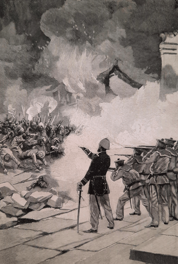 Jusqu’à 3 heures, calme complet. A 3 heures, la fusillade commence, mais très peu dense. A 5 heures, attaque à la grande porte. Fusillade nourrie, essai de feu, pétrole, torches, etc. Cela dure jusqu’à minuit et demie. Les derniers Boxeurs ayant été mis en fuite par une salve, je fais mettre le feu aux maisons qui les abritaient. Auparavant, des Chinois sont allés prendre tout ce qui était de bonne prise. Trouvé deux grandes pompes pleines de pétrole, une caisse de balles, une caisse de poudre, des habits, un sextant en très bon état, etc., mais peu d’armes. Ils ont pu apercevoir dix cadavres.