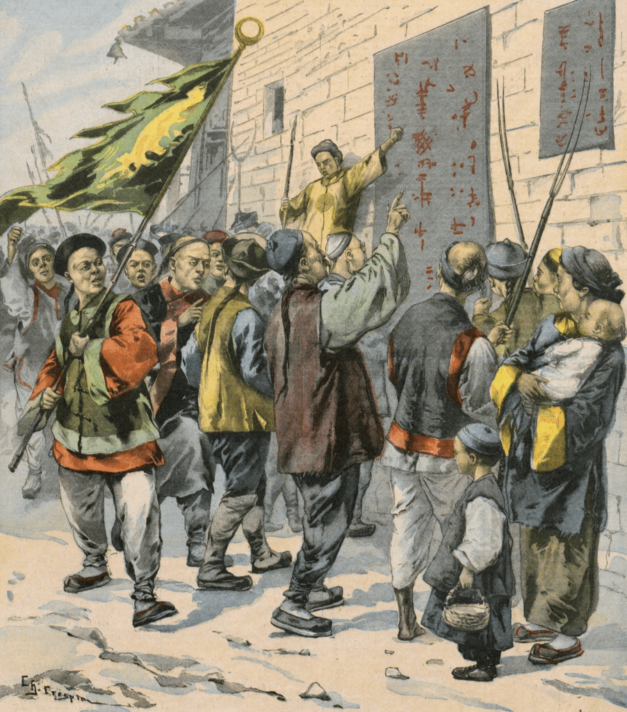 11 juin 1900. – A 10 heures, comme l’exercice du fusil finissait, les Chinois arrivent en faisant de grands gestes affolés. « Vite, vite, les Boxeurs arrivent : aux postes de combat ! » En un clin d’œil, les hommes sont à leurs postes, les paquets de cartouches défaits. Les Boxeurs arrivent, ils doivent être à cinq cents mètres. Je vais en avant de l’entrée voir quand on pourra ouvrir le feu ; je ne vois rien ; j’attends, rien, toujours rien. A la fin, les vigies qui sont placées en haut de l’église me font prévenir que les Boxeurs, au lieu de se diriger sur le Pé-T’ang, ont tourné à gauche, et ont filé sans tambour ni trompette. Fausse alerte. Nous rompons et rejoignons notre casernement.