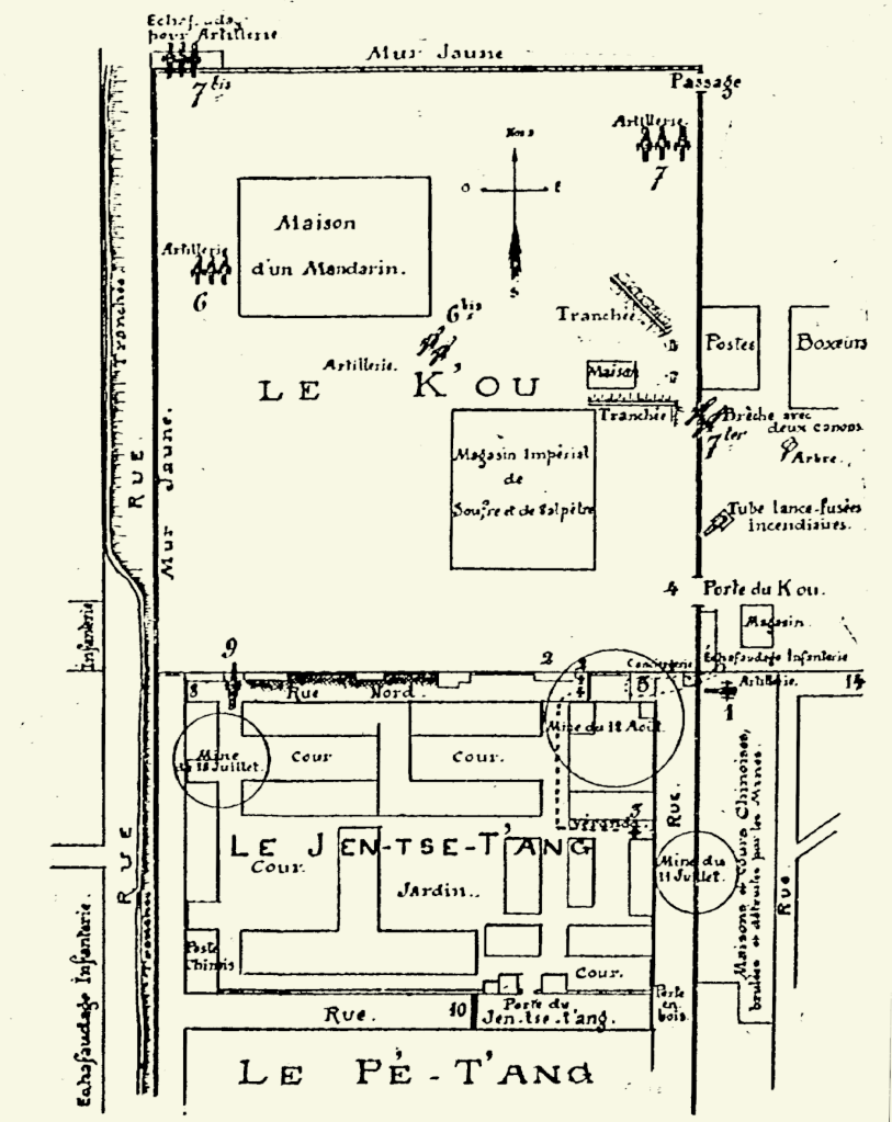 Samedi 7 juillet. – Vers 5 heures, des gens postés derrière le mur jaune, au sud-ouest, envoient une quantité de bombettes, grenades, pots à feu, etc. : mais les commencement d’incendie sont vite éteints, et nous n’avons aucun blessé. A 7 heures, des canons postés au nord ouvrent le feu ; je me porte au Jen-Tsé-T’ang avec cinq hommes, et je fais établir notre canon sur un épaulement préparé derrière le mur nord ; jusqu’à 8 heures et demie, le tir, étant mal réglé, ne nous cause aucun mal. Je fais envoyer quelques salves ; mais vu la distance et la protection, pas d’effet. Quelques coups de canon au nord et à l’est. De 8 heures 50 à 9 heures, trêve. A 9 heures canonnade recommence avec des canons européens, calibres 80 à 90mm. Obus ordinaire et obus à mitraille. Le tir est rapidement réglé ; malgré nos salves, les obus viennent tomber auprès de nous. L’un éclate devant notre canon, et blesse très légèrement deux hommes. Un second éclate un peu en arrière, et tue le canonnier. Nos salves, bien que justes, ne causent aucune gêne aux Chinois. Après avoir attendu quelque temps, nous nous décidons à cesser une consommation de cartouches aussi inutile. Les hommes sont à l’abri, un factionnaire restant pour prévenir d’un assaut peu probable. La canonnade continue toute la journée, se ralentissant vers la fin de l’après-midi pour cesser vers 7 heures. Le projectile le plus constamment lancé est l’obus ordinaire de 80 à 90mm, des quantités considérables de fusées, de bombes qui nous viennent du nord-est.