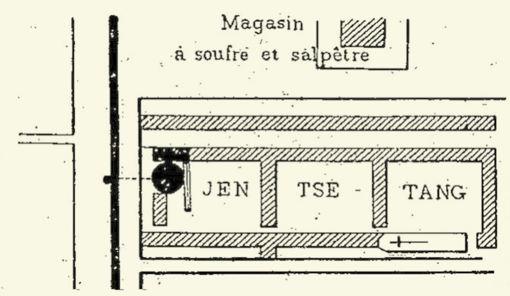 Dimanche 22. – Dans la matinée pris du salpêtre et du souffre au K’ou. A midi, fait un feu à répétition de quatre hommes, dans l’ouest du mur jaune. Les soldats chinois laissent sur le terrain environ 25 morts, dont deux mandarins. De notre côté, deux Chinois légèrement blessés. Vers 7 heures et demie, un homme (Le Sec’h), du poste du nord-est, est blessé d’une balle à la tête (imprudence et désobéissance). Dans la nuit, une pluie torrentielle nous force à évacuer les casemates ; pas d’incidents. Fusillade continuelle des Chinois.