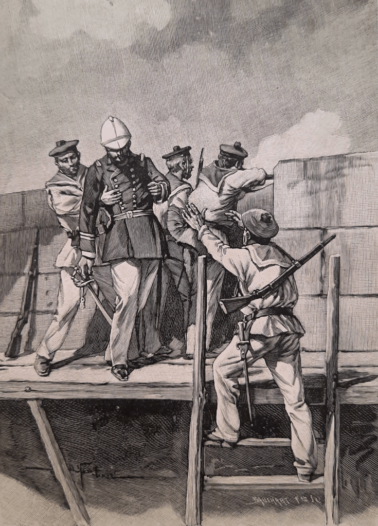 A 7 heures, les soldats massés dans les maisons qui sont devant la grande porte, ouvrent un feu extrêmement violent. Je fais mettre les hommes à l’abri derrière le remblai, baïonnette au canon, parés à repousser l’assaut. Mais, au bout d’une demi-heure environ, le feu cesse. Nous n’avons eu aujourd’hui ni tué ni blessé par le feu de l’ennemi ; un marin italien a été blessé à la figure par son fusil qui a fait explosion.