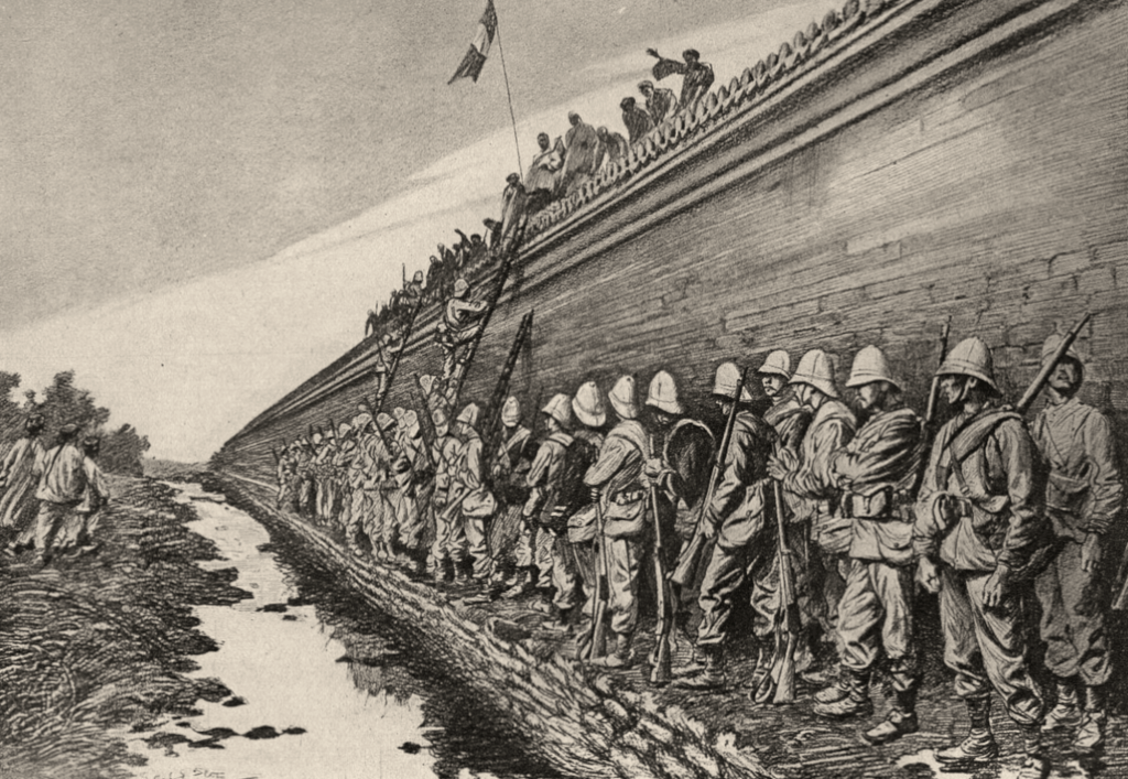 22 juin 1900. – A 6 heures 30, on me fait prévenir que deux canons viennent d’être postés en arrière de la porte. Je me porte aussitôt, avec le poste de garde, derrière le remblai, et je fais prévenir le reste du détachement de se rendre immédiatement aux postes de combat. Au même instant, une troupe de soldats chinois se présente à la porte, et ouvre sur nous un feu assez violent de mousqueterie. Nous ripostons et les mettons en fuite. Ils reviennent une seconde fois, puis disparaissent au bout de quelques minutes. A 7 heures, des canons établis dans la rue, à l’abri d’un repli de terrain, ouvrent le feu sur nous. Leur tir est très bon. La plupart des coups viennent frapper les remblais de la porte, et nous ne pouvons que difficilement leur répondre, le feu étant relativement rapide, environ un coup et demi par minute, et, dans l’intervalle, la fumée nous masquant toute l’entrée du chemin. Plusieurs obus labourent la partie supérieure du remblai ; l’un enlève une baïonnette, mais personne n’est blessé. Vers 8 heures et demie, les canons commencent à viser plus particulièrement l’église. Un canon situé au sud-ouest prend le même objectif. Le tir du sud devenant plus lent, nos coups de fusil commencent à produire un bon effet, plusieurs servants sont démolis : à 9 heures et demie, les pièces sont enlevées tant au sud qu’au sud-ouest.