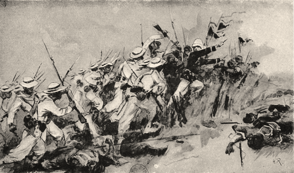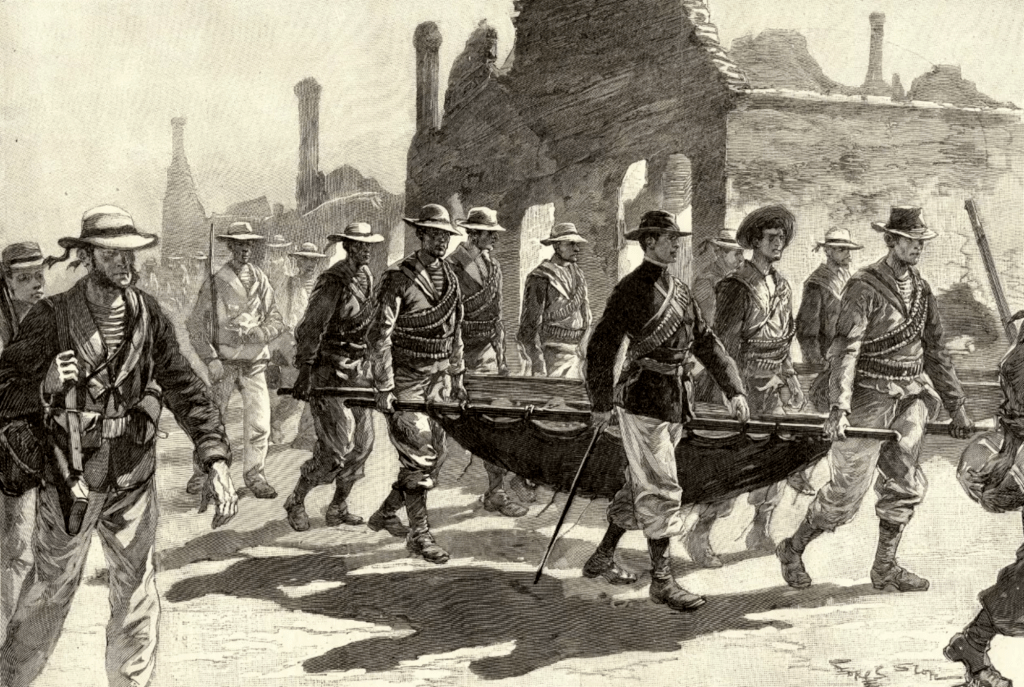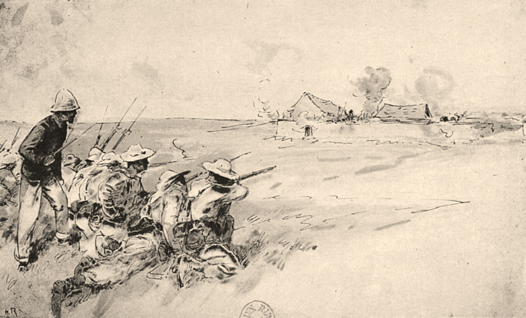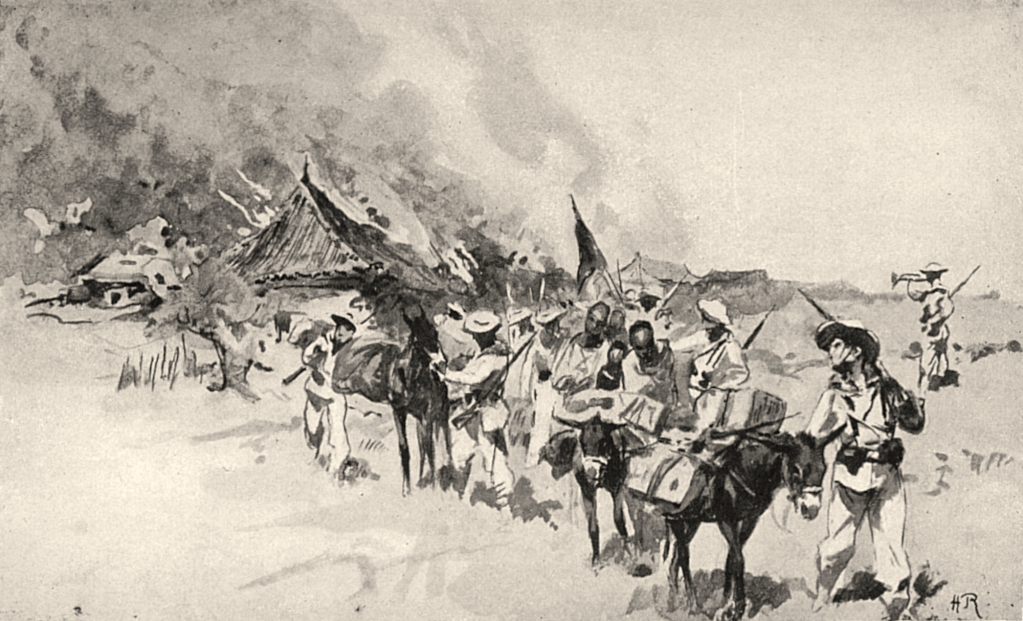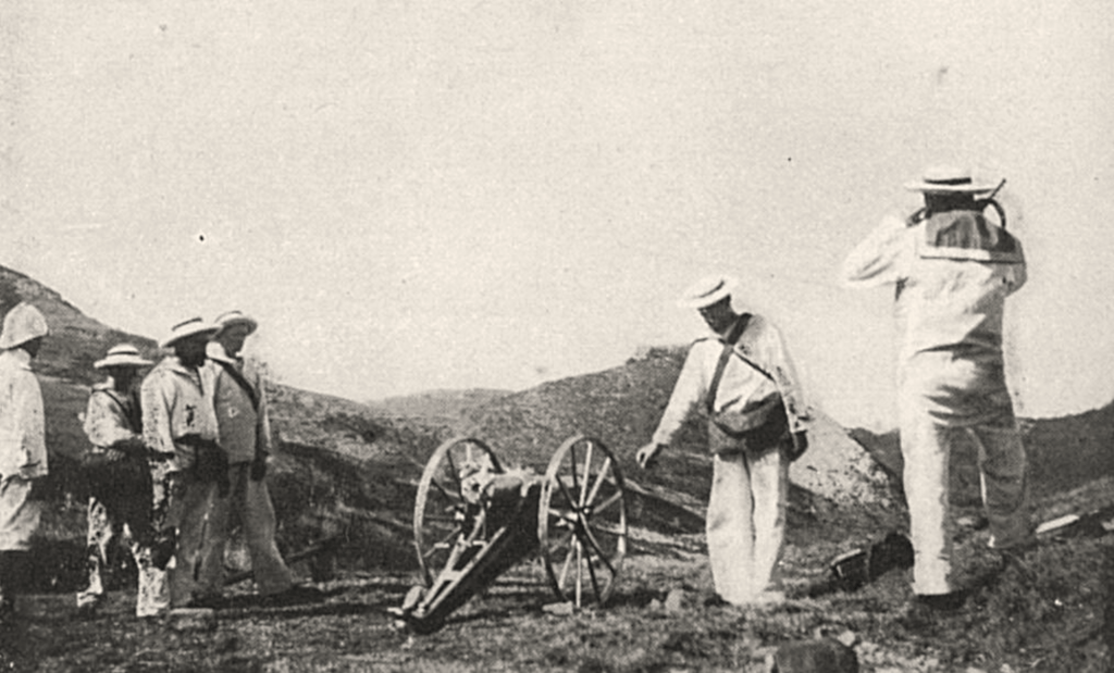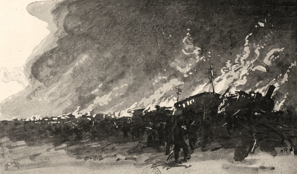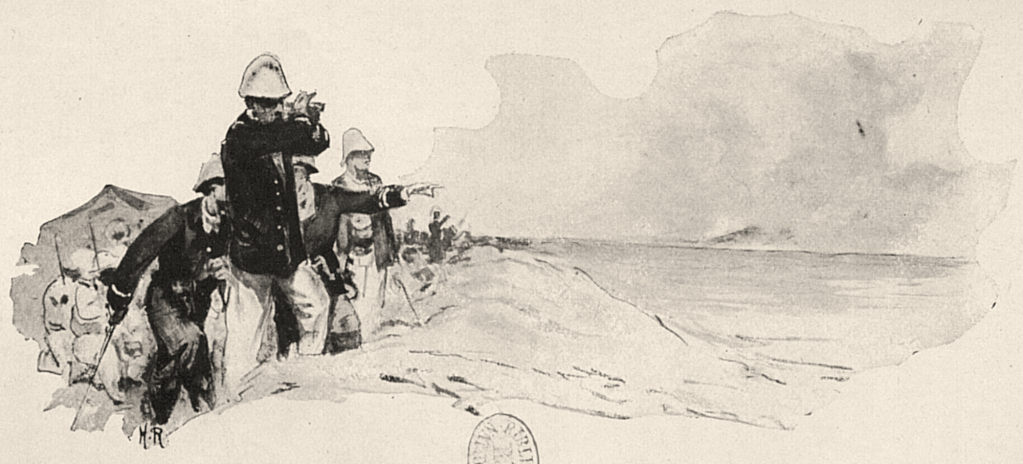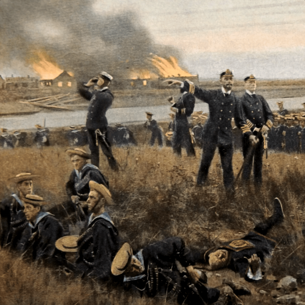 La colonne reprend sa route tant bien que mal. Le lieutenant de vaisseau Ronarc’h (1865-1940), qui s’illustrera en 1914 à la tête des fusiliers marins à Dixmude, se montre partout et encourage ses hommes. Les marins retirent les vareuses et pantalons de laine, et ne portent que leurs vêtements de fatigue en toile blanche.