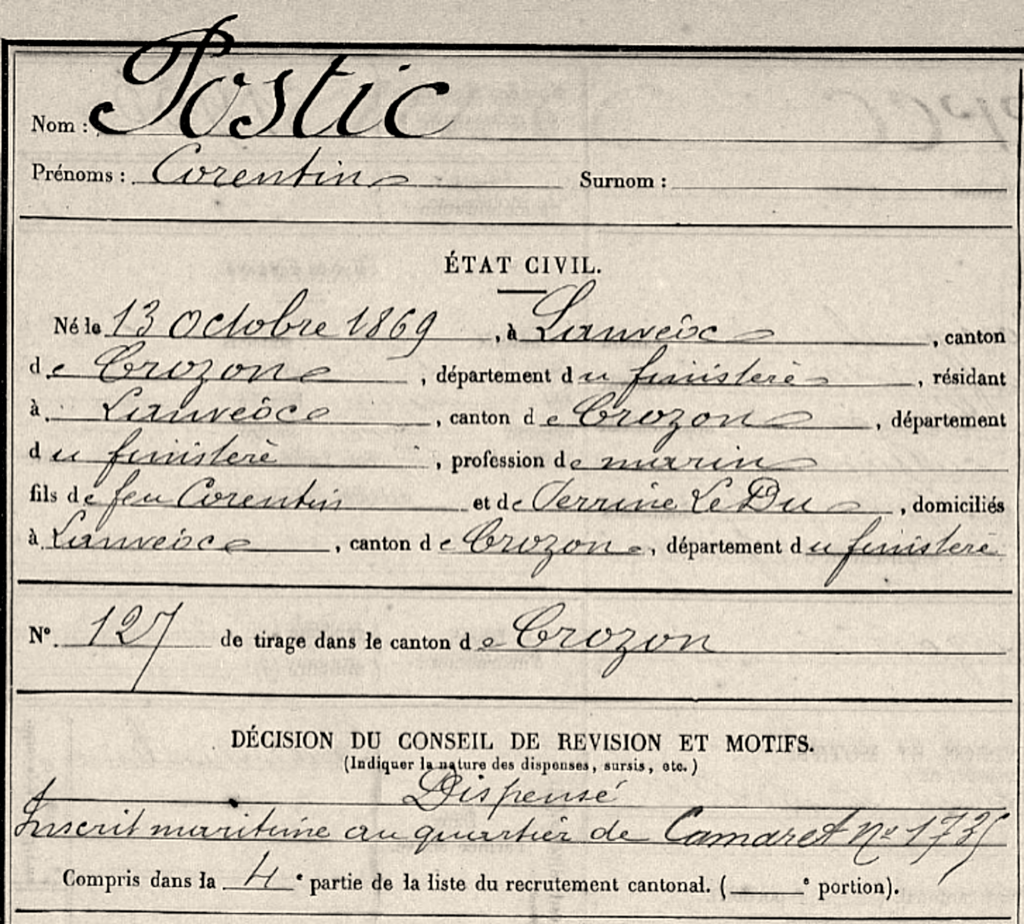 A vingt ans, Corentin perd son père le 9 mai 1889. La même année (né en 1869 il est de la classe 1889 pour l’administration militaire), il est dispensé de service militaire : sa profession de marin le destine l’inscription maritime, enregistrement des gens de mer appelés à servir dans la Marine nationale. Il est ainsi inscrit au quartier de Camaret sous le n°1735. Le registre matricule porte donc peu d’information, mentionnant seulement le degré d’instruction 3 selon les prescriptions de l’instruction du 26 novembre 1872. Sur une échelle de 1 à 5, cela signifie qu’il sait lire et écrire, sans avoir reçu d’instruction primaire plus avancée.