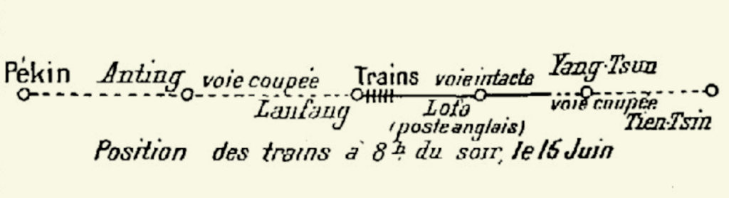 On se résout à poursuivre en train vers Pékin. Le convoi est réorganisé, les Français occupant désormais avec les Italiens le quatrième train, en queue de colonne, et sont chargés de patrouiller entre le convoi principal et le cinquième train occupé par les Allemands, qui a pour mission de réparer la voie vers Tien-Tsin. On constate rapidement que les Boxeurs tentent d’isoler le train des Français en pratiquant une nouvelle coupure des voies. Le détachement est bientôt à cours de vivres, le trajet n’étant pas sensé durer si longtemps. Un village à proximité est pillé puis incendié après la découverte d’insignes de partisans des Boxeurs.