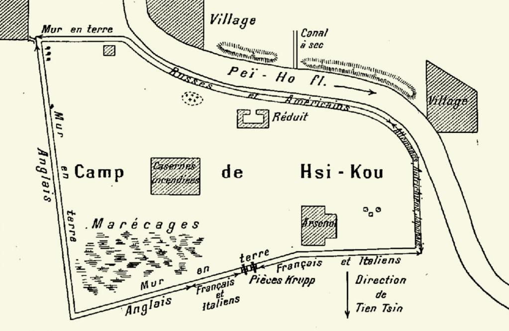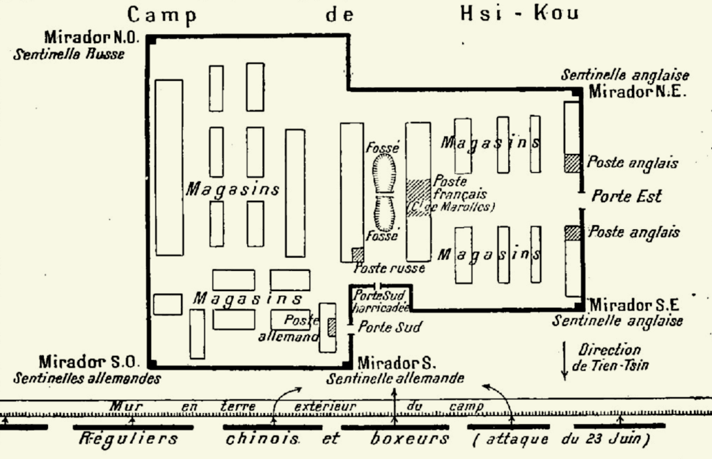 Les troupes les plus aptes au combat occupent l’arsenal, position avancée au Sud du camp, vers laquelle seront certainement dirigés les assauts chinois. Fait unique trois décennies après la guerre de 1870, les Allemands s’y trouvent placés sous le commandement d’un officier Français ! Corentin Postic et les blessés sont mis à l’abri plus loin, dans le réduit du camp, proche du fleuve. D’autres troupes y sont postées en protection.