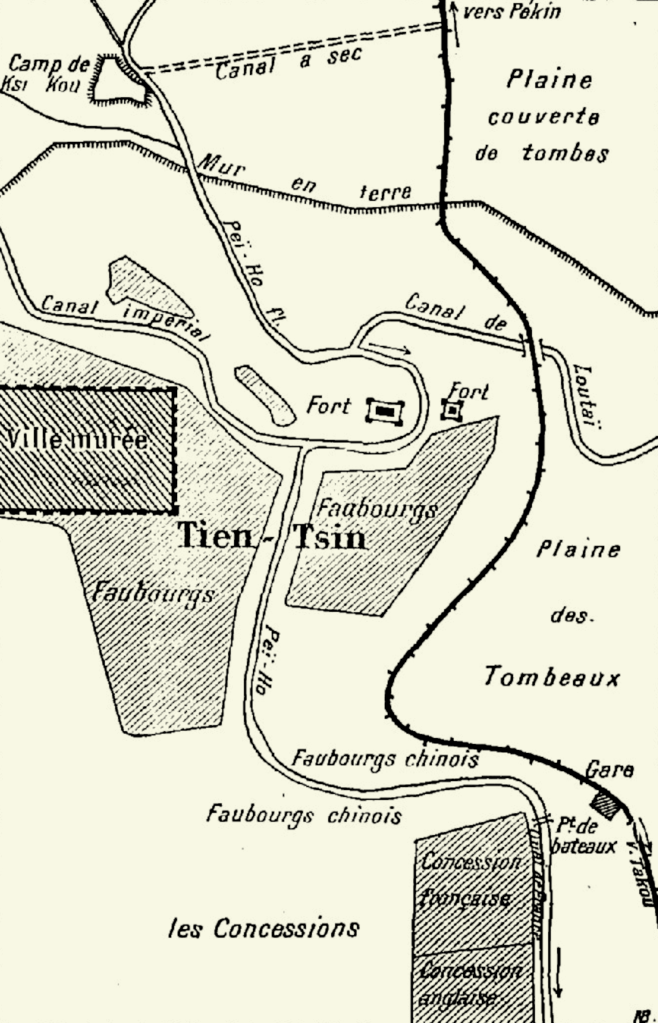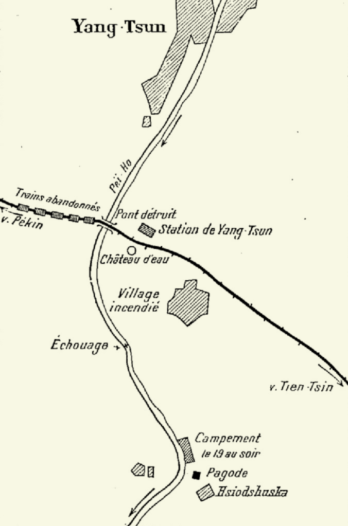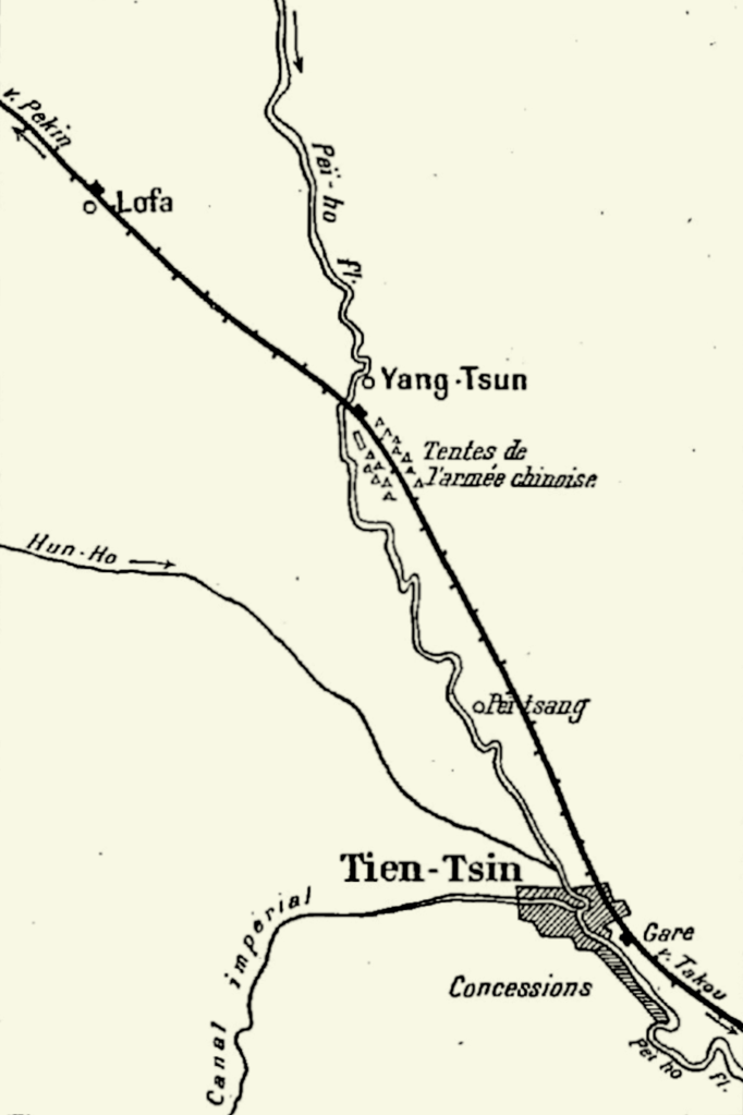 La voie ferrée contourne par l’Est les forts de Tien-Tsin. Longeant le Pei-Ho, le train ralentit bientôt sa marche. Des deux côtés de la voie se dessinent les rangées blanches des tentes de l’armée régulière chinoise. Les Chinois ne montrent pas d’hostilité, et le train reprend sa route pour une halte à Yang-Tsun.